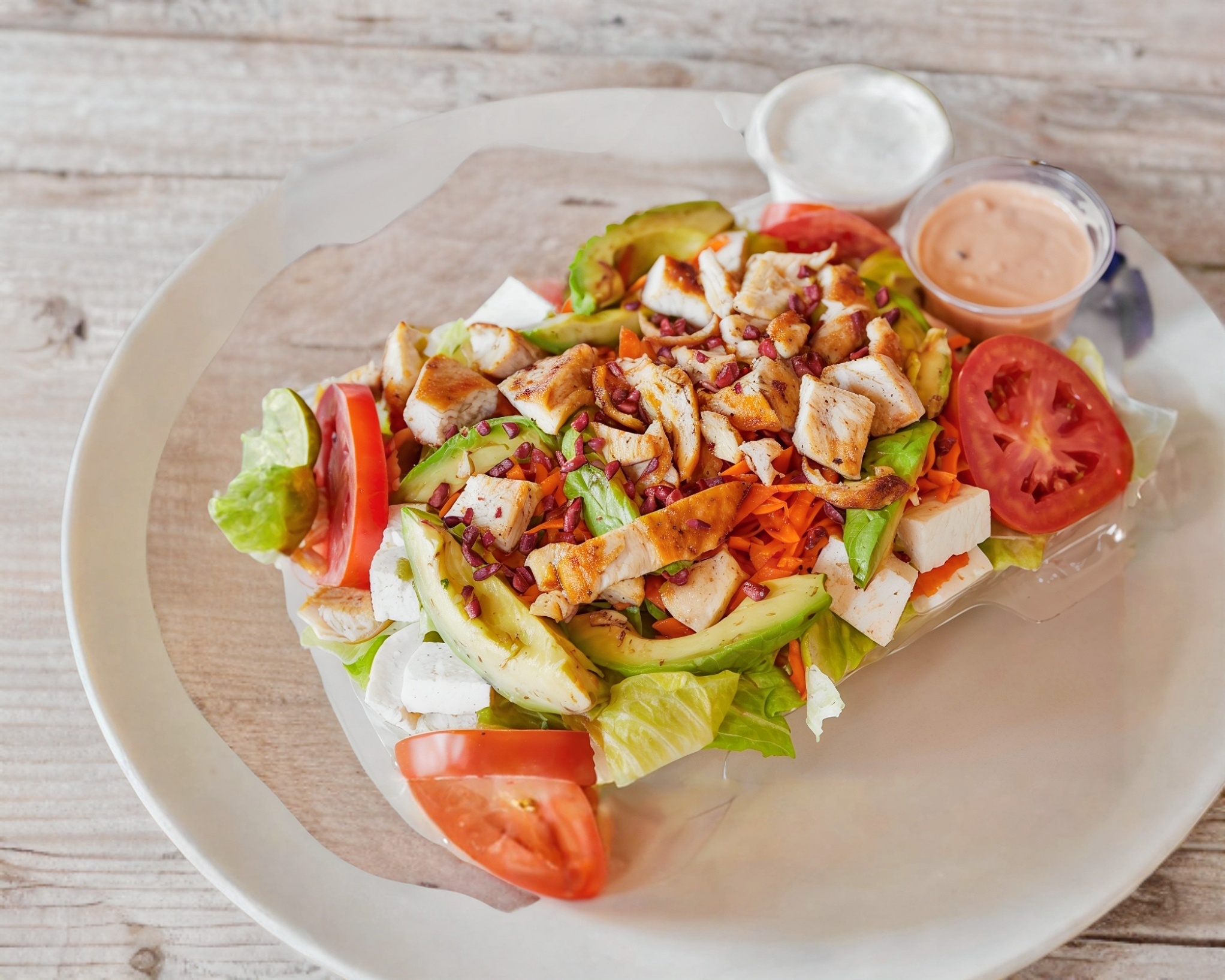 Mezcla de lechugas con pollo con aderezo ranch y mil islas