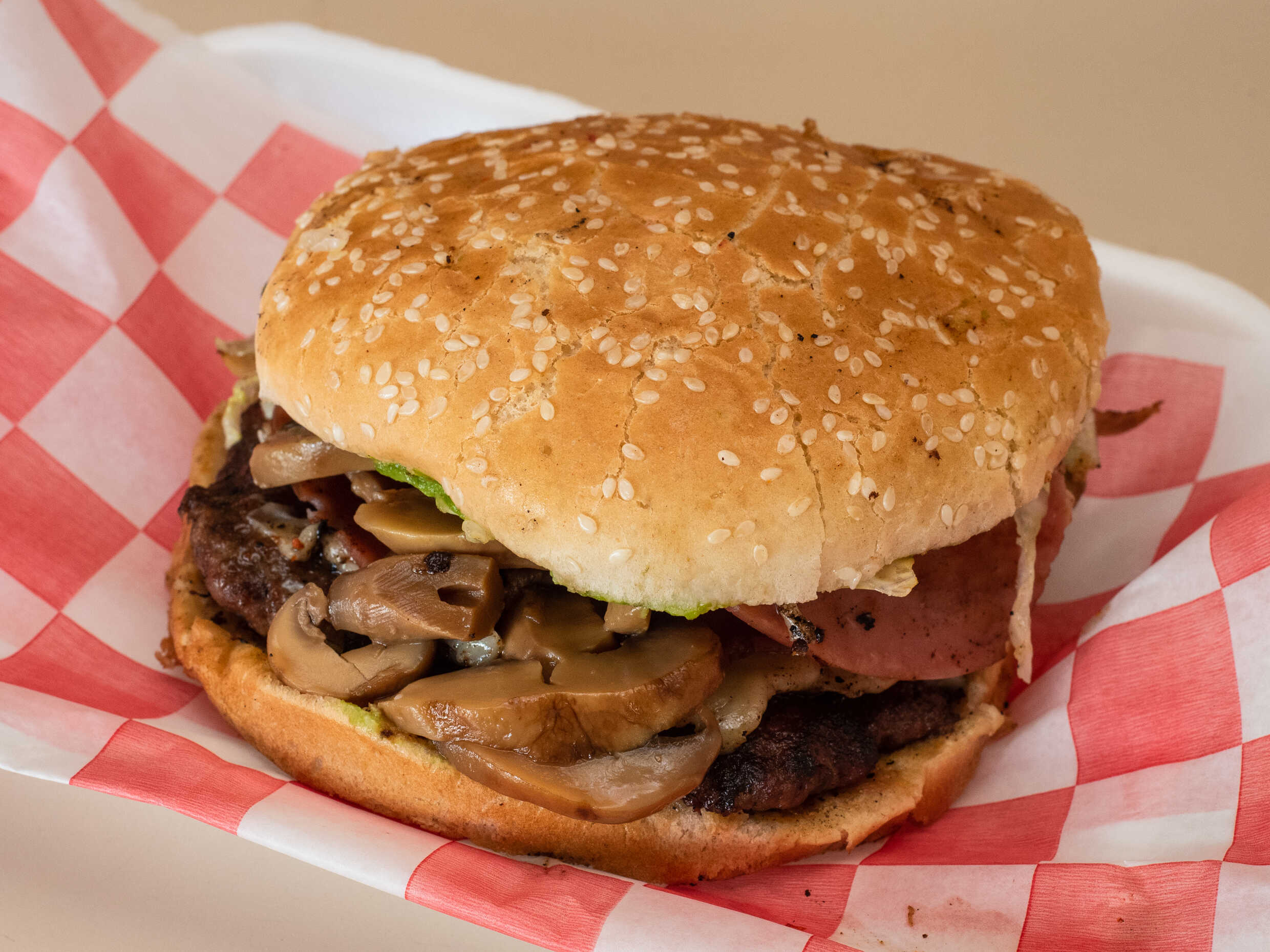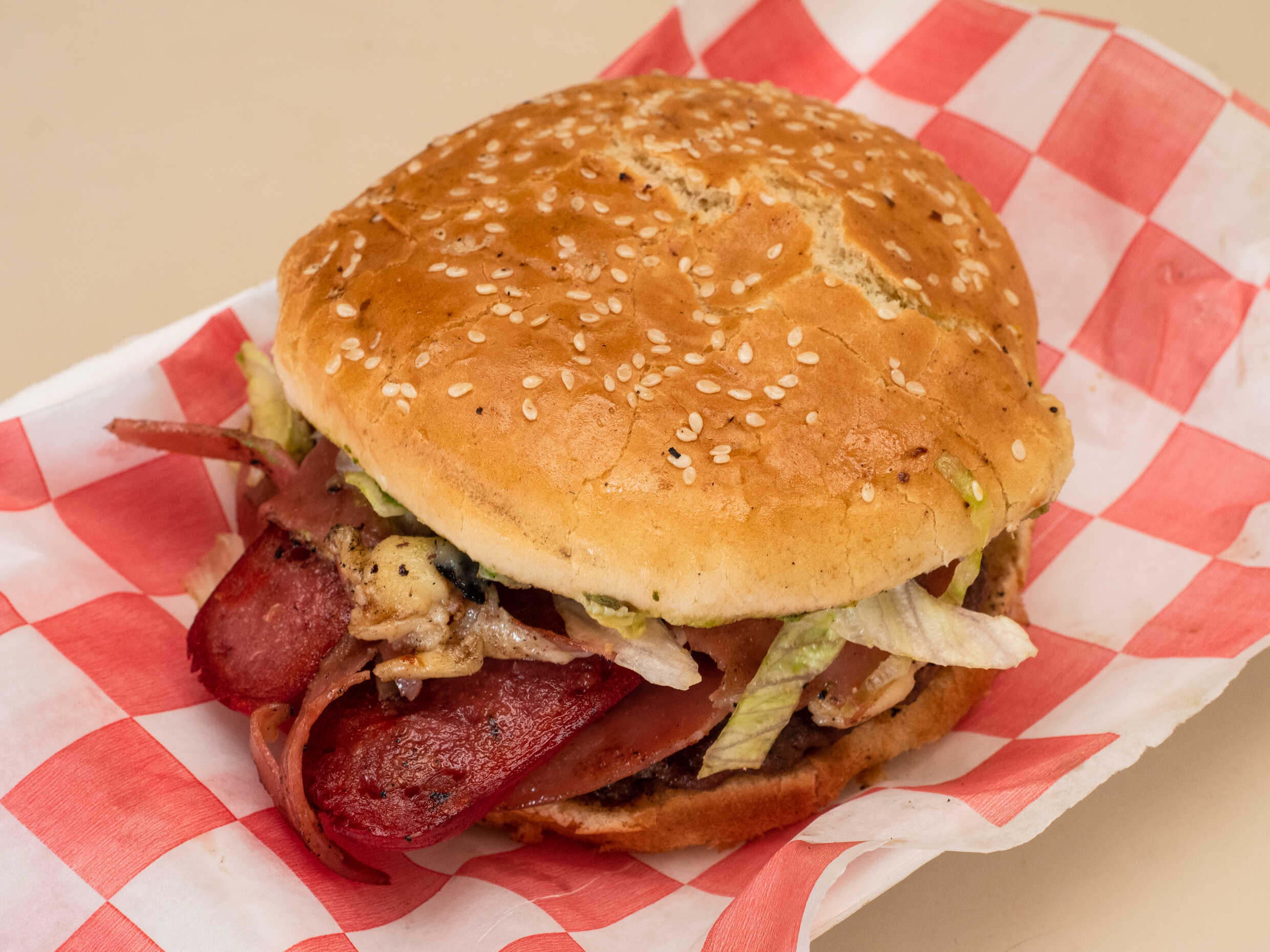 Lleva carne, cebolla asada, BBQ, queso, jamón y salami.