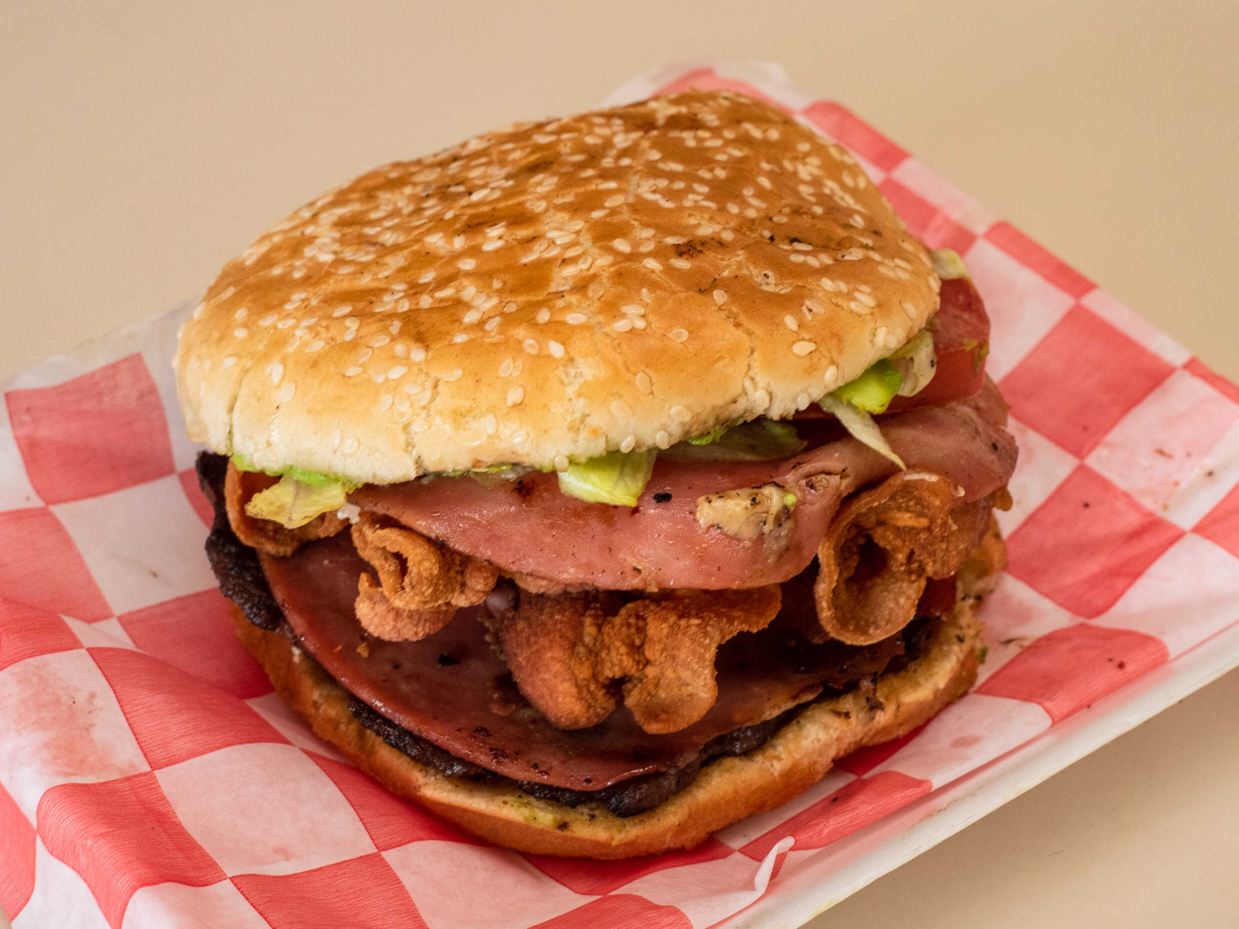 Lleva queso asadero, jamón, salami, aguacate, tomate, lechuga, mayonesa, mostaza, sobre de cátsup y sobre de chiles. Carne de res y trompo.