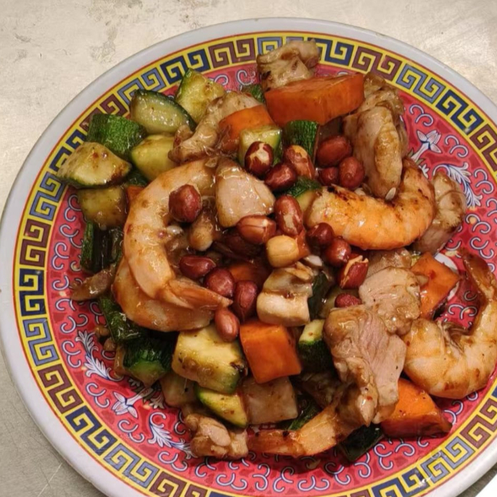 Pollo con camarón verduras y cacahuate mixto Más pollo a la plancha y arroz