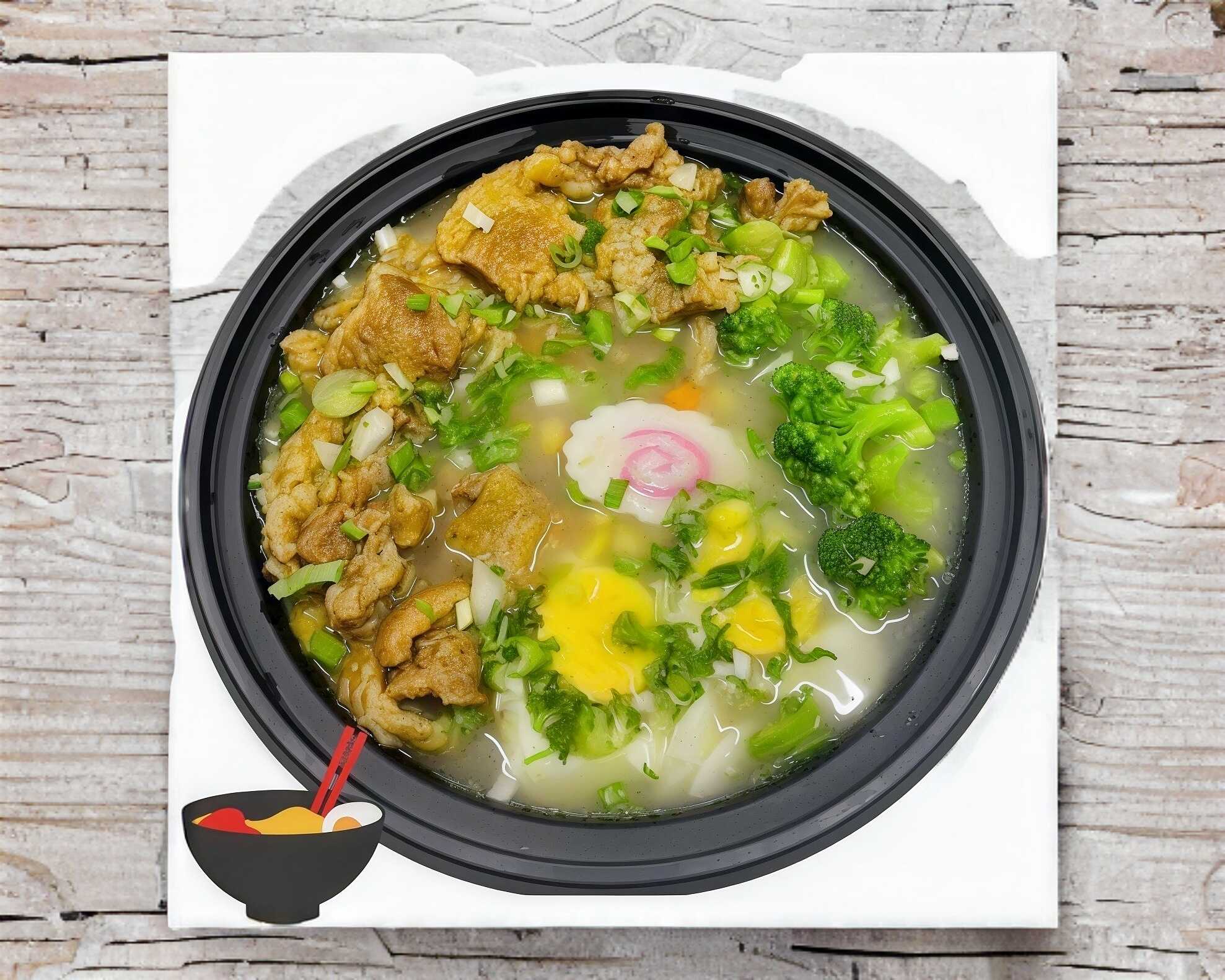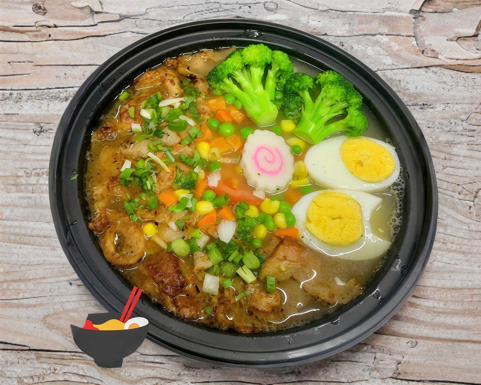 Fideo en ramen con pollo grande acompañado de brócoli, huevo, naruto , cebollín ,verduras mixtas y cilantro.