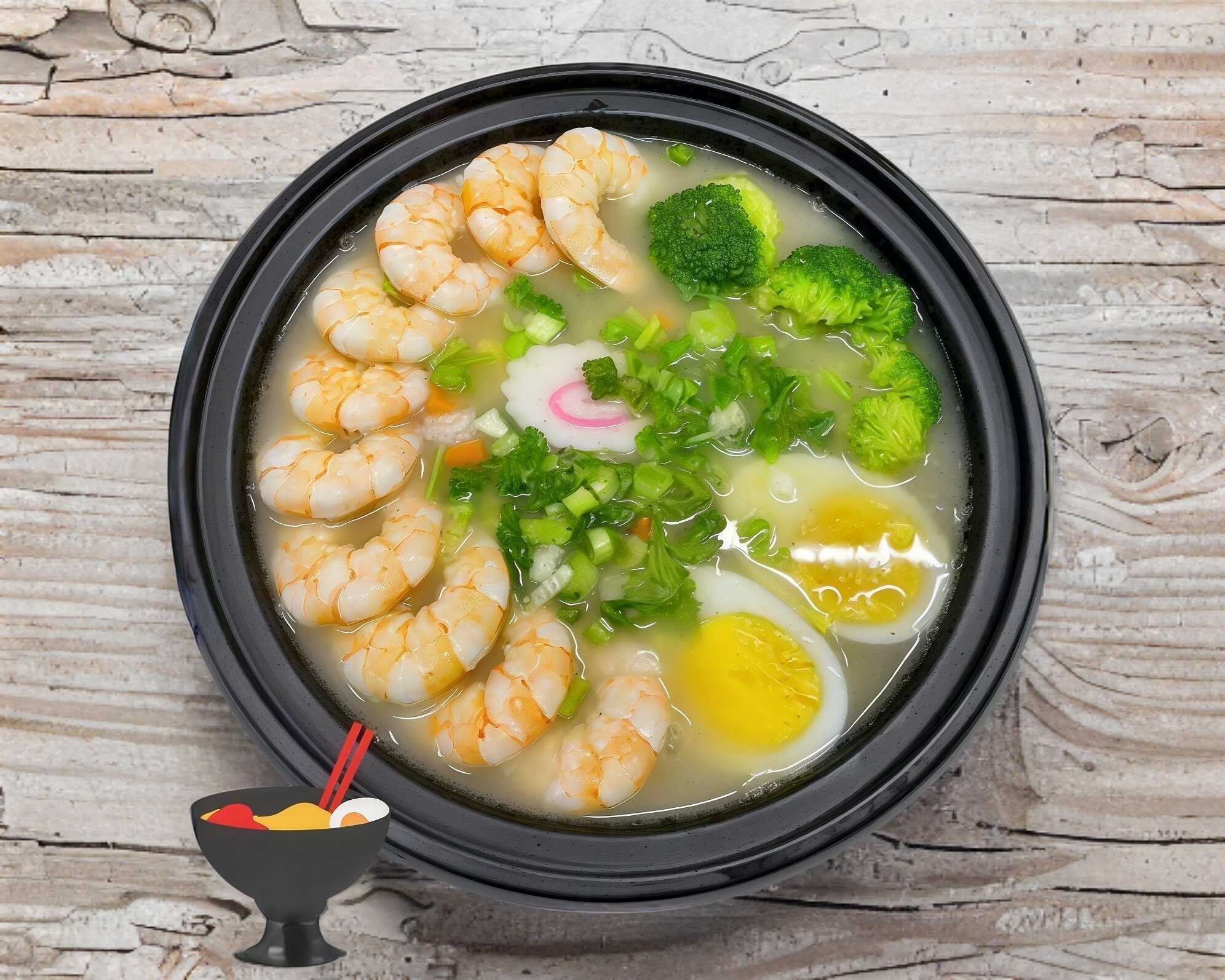 Fideo en ramen con camarón grande acompañado de brócoli, huevo, naruto , cebollín ,verduras mixtas y cilantro.