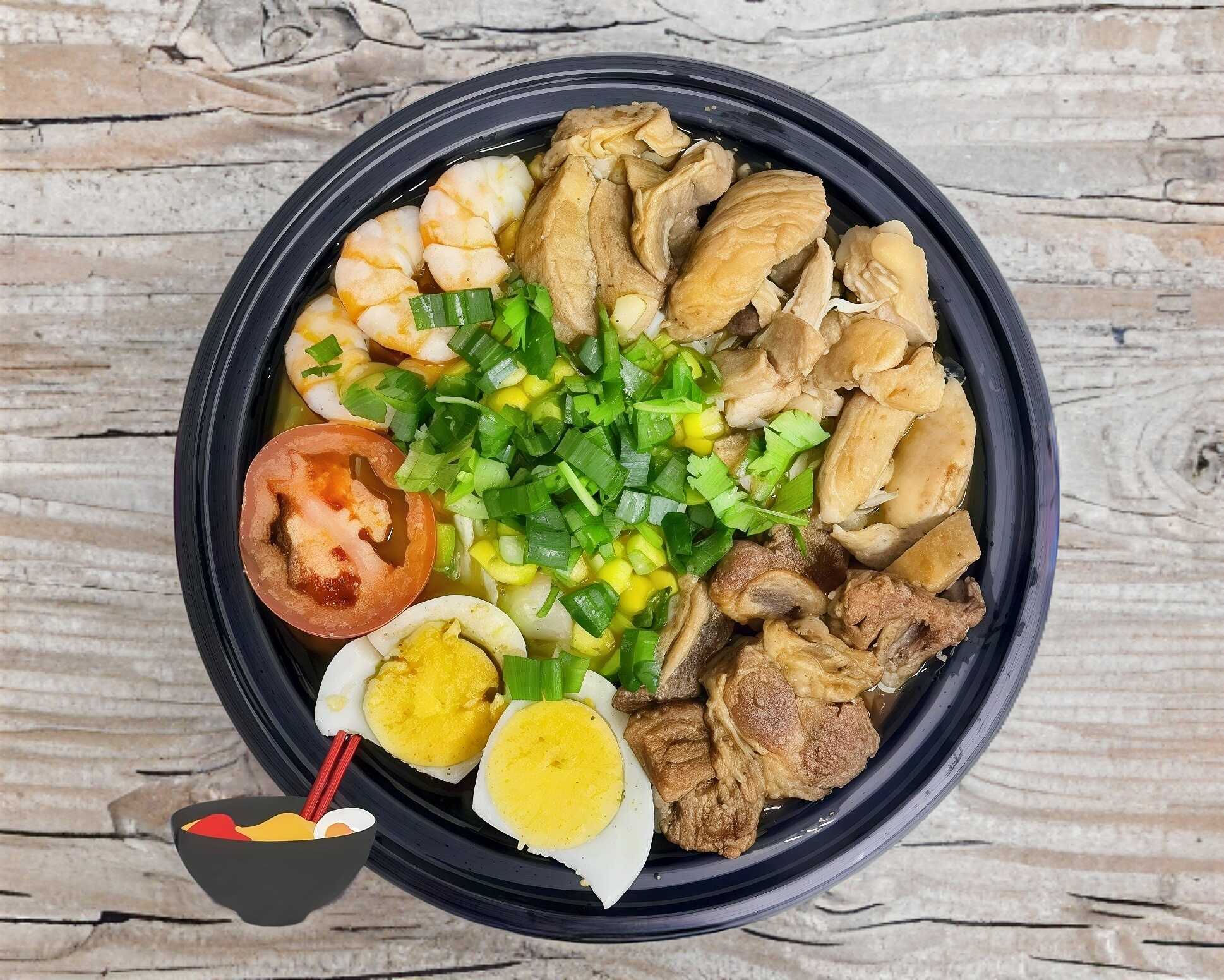 Ramen grande con carne de res, pollo y camarón acompañado de brócoli, huevo, naruto , cebollín ,verduras mixtas y cilantro.