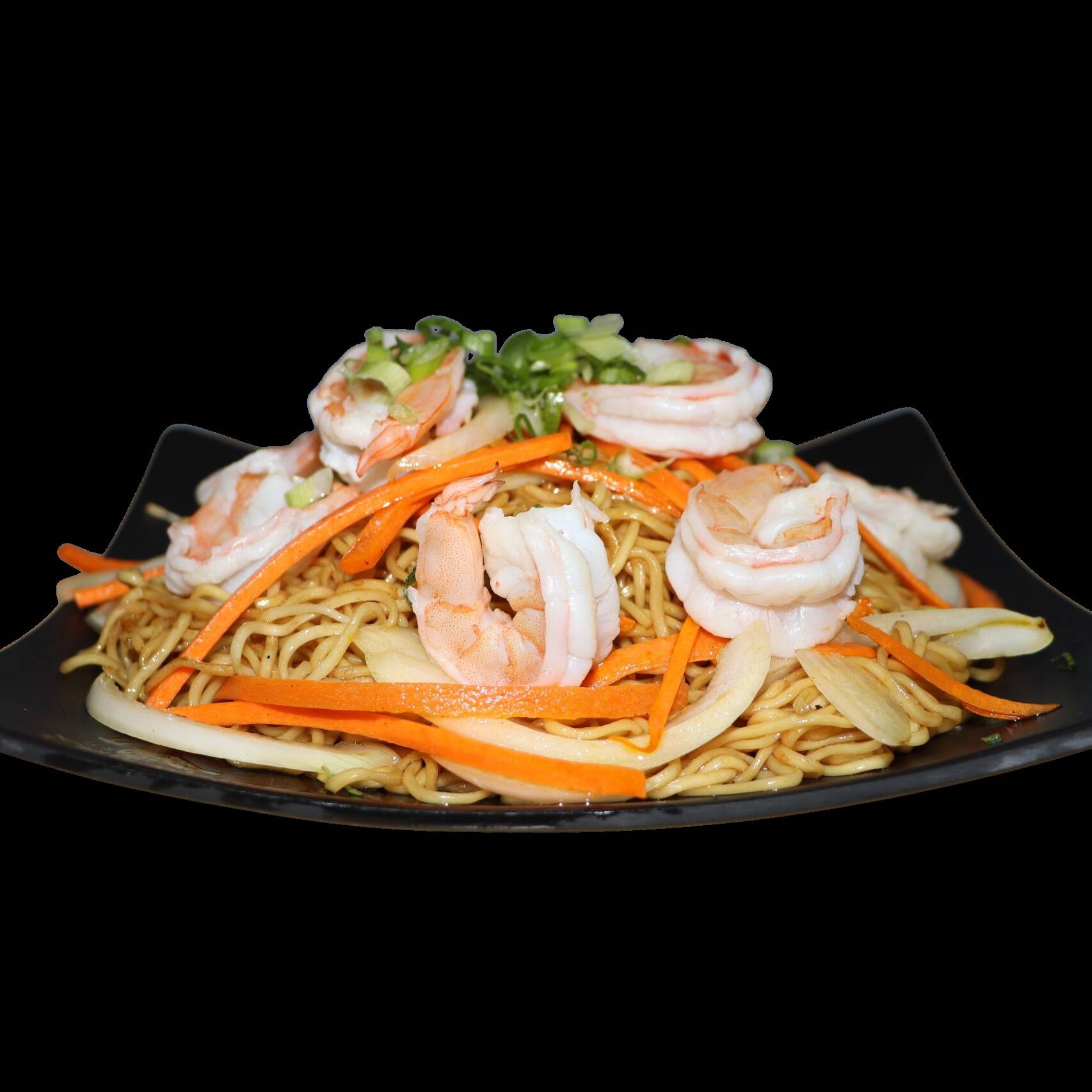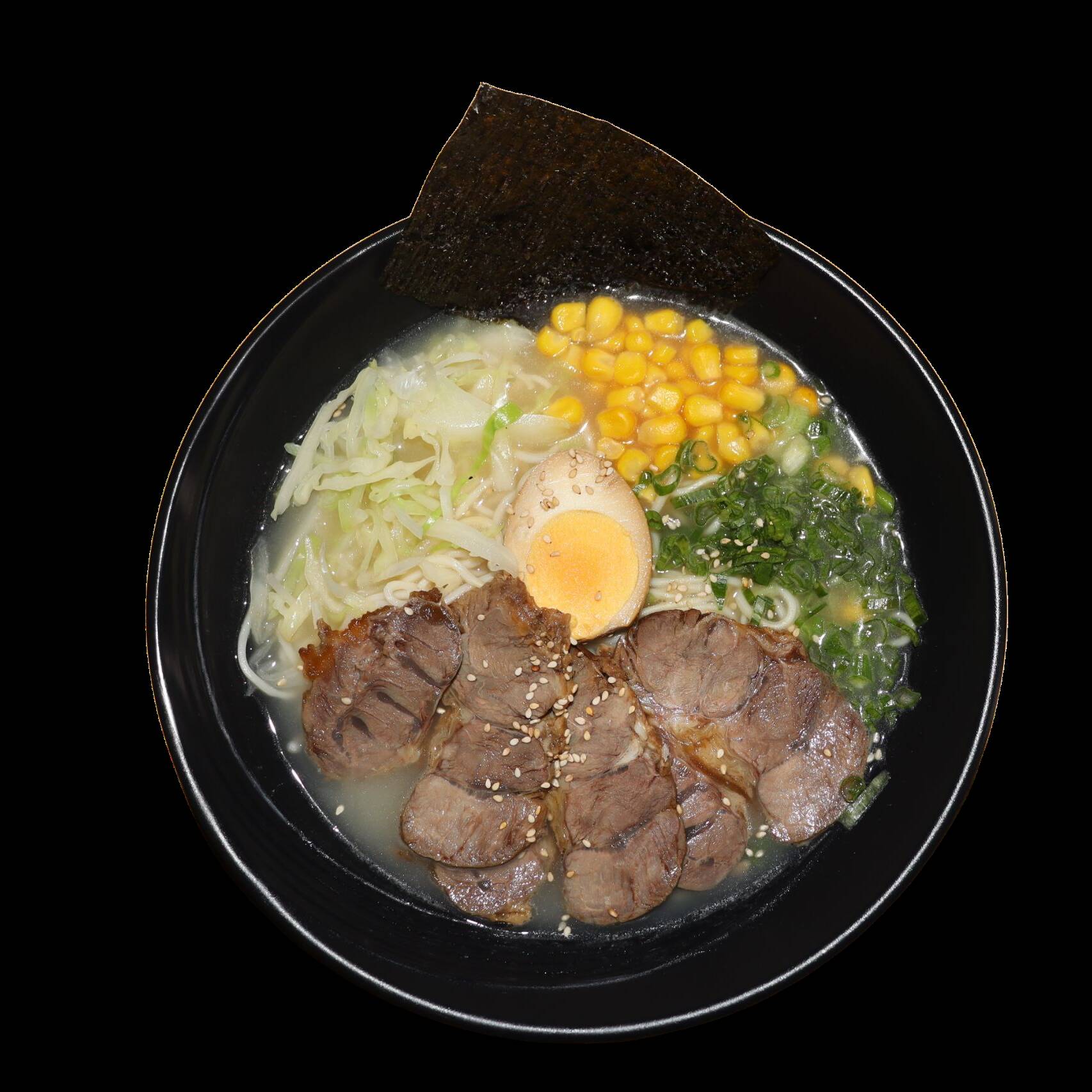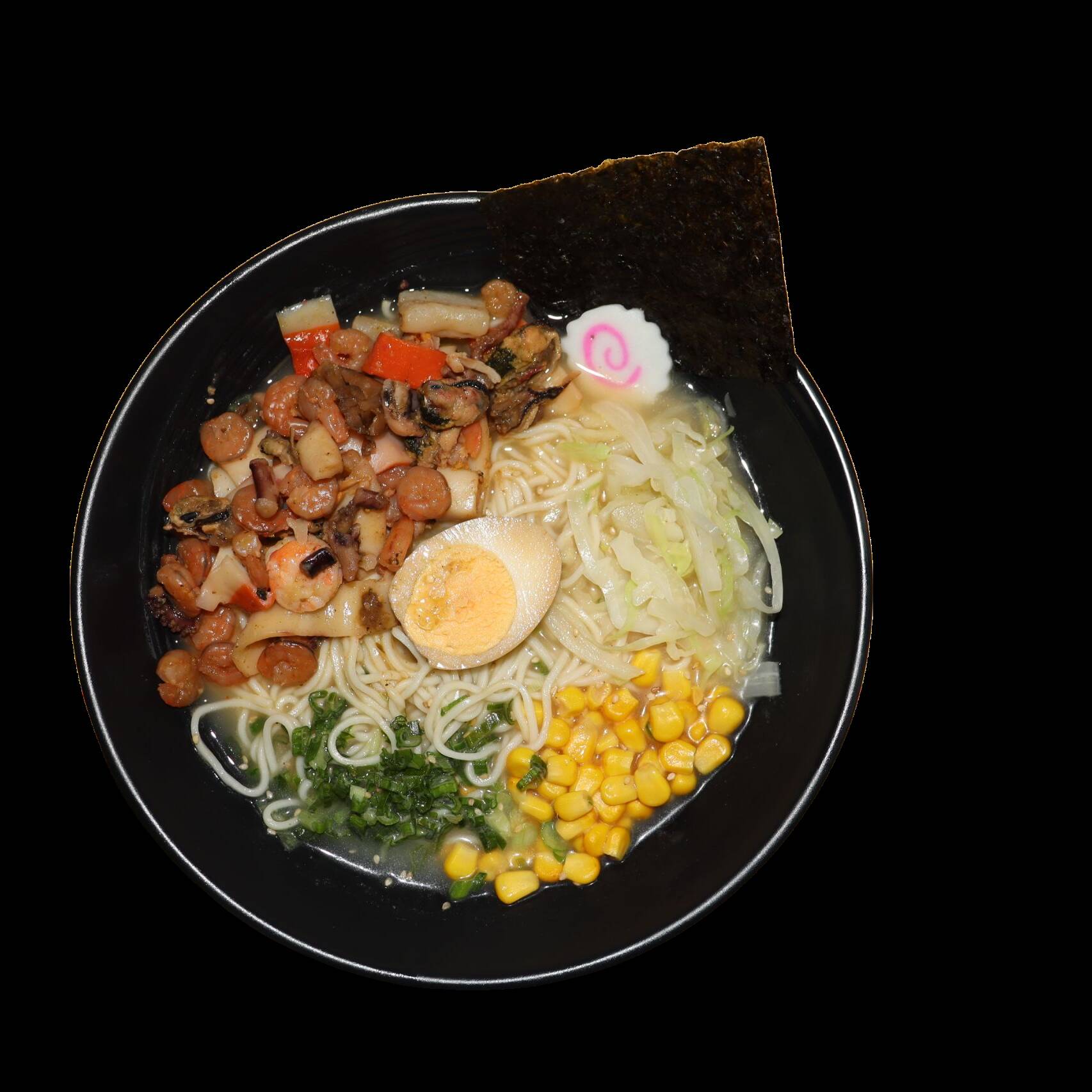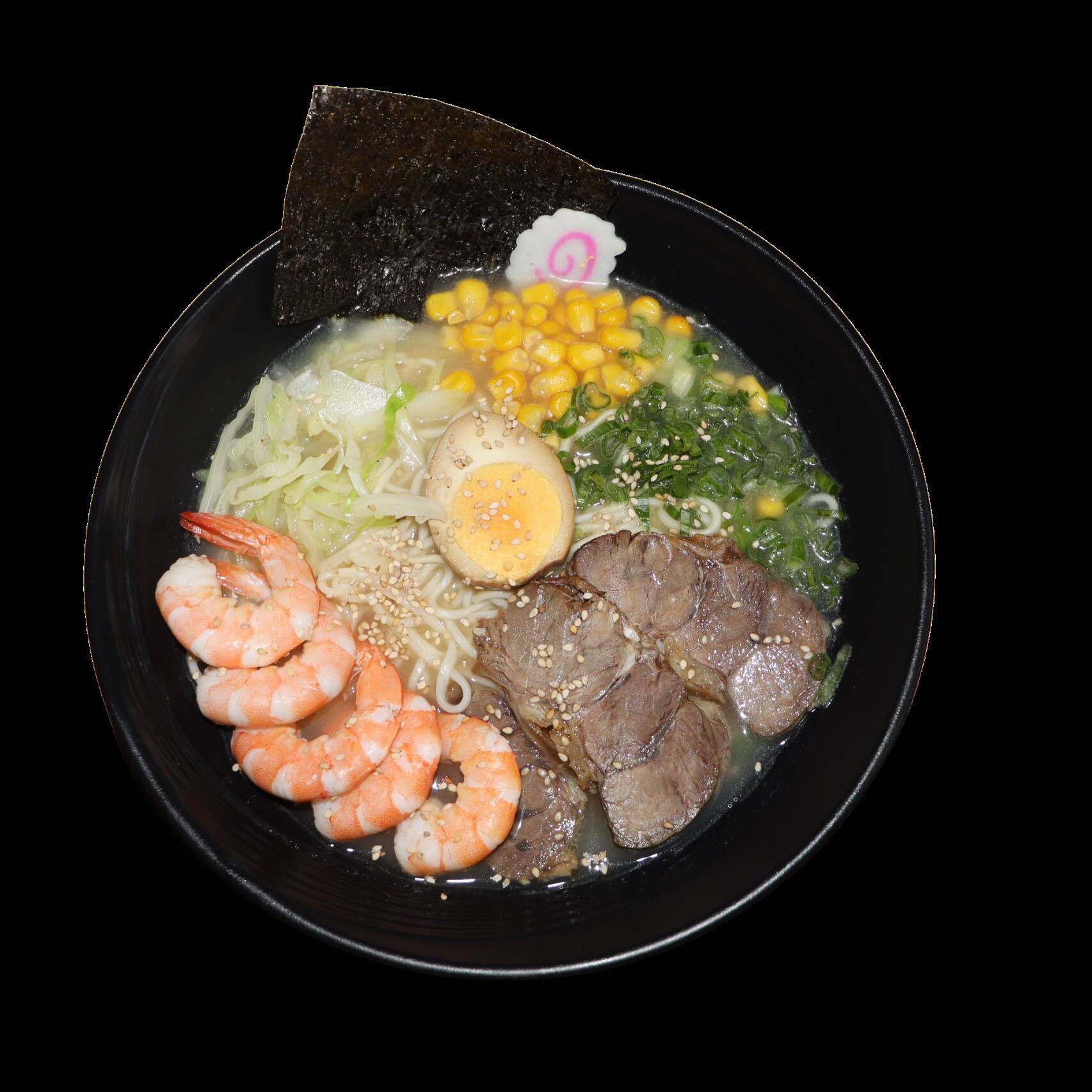 Carne de res, camarones, naruto, alga, huevo, col, elote y cebollín.