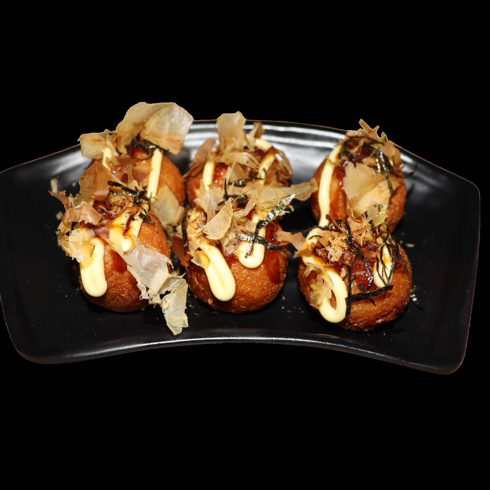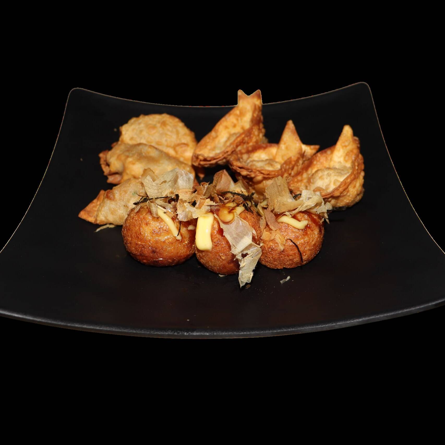 Contiene 3 piezas de Gyozas de puerco,3 pzs de takoyakis y 3 pzs de wonton frito