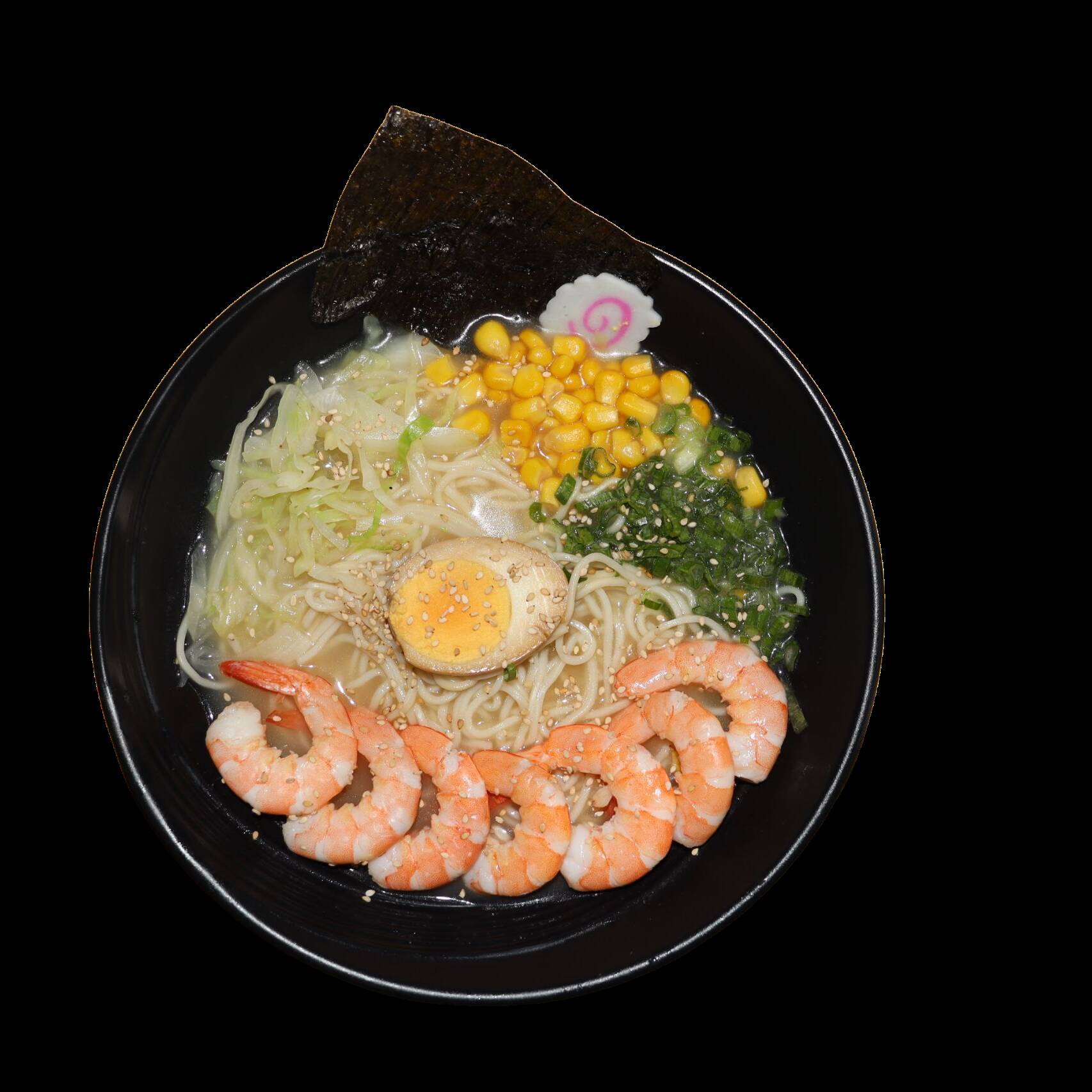 Camarón, naruto, alga, huevo, col, elote y cebollín.