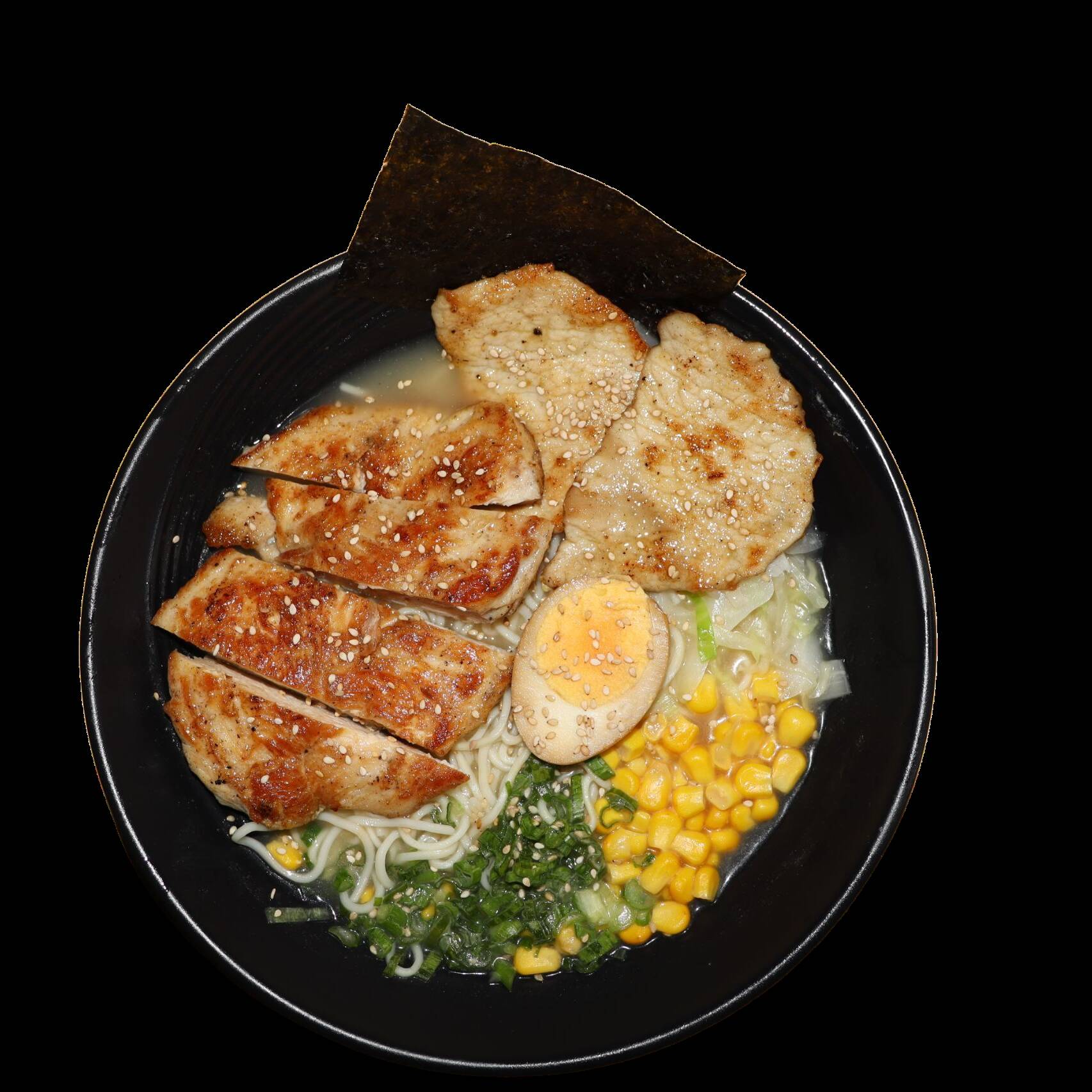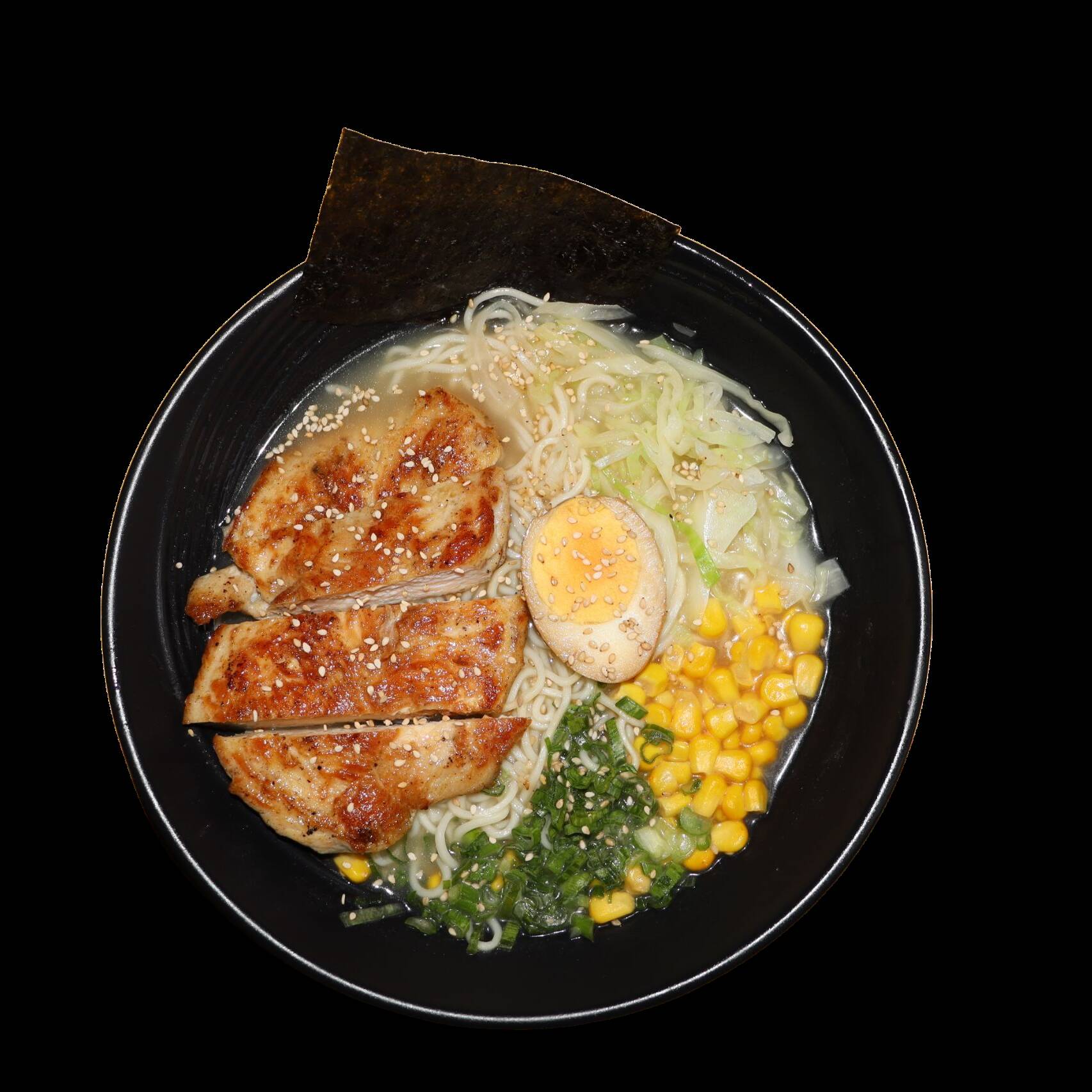 Suaves rebanadas de filete de pollo a la plancha, alga,huevo,col, elote y cebollín.