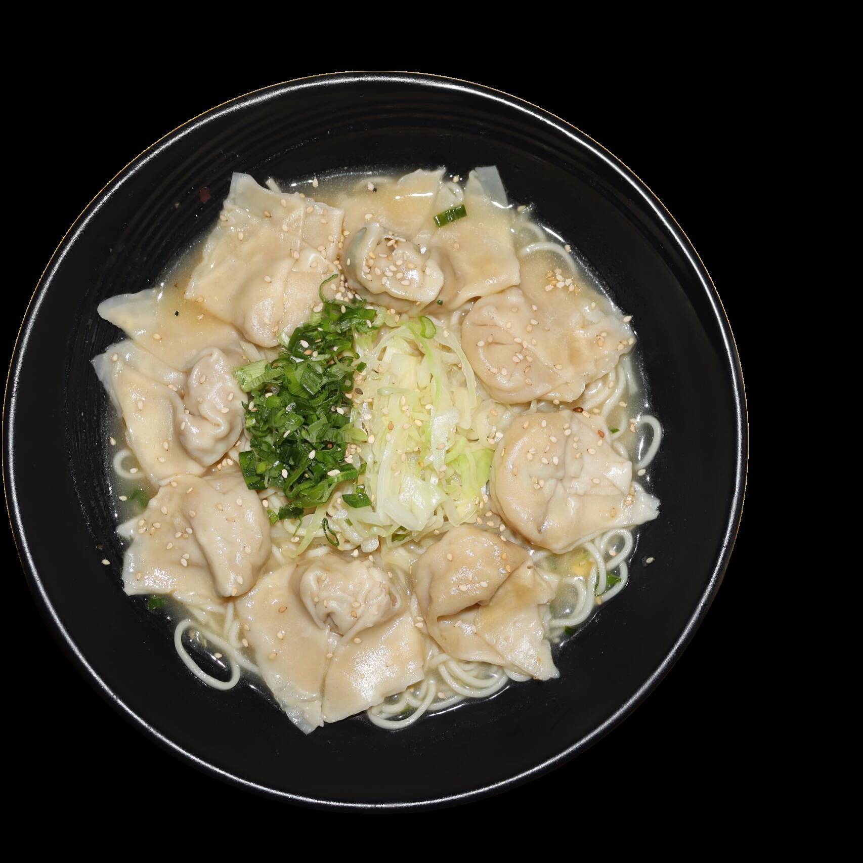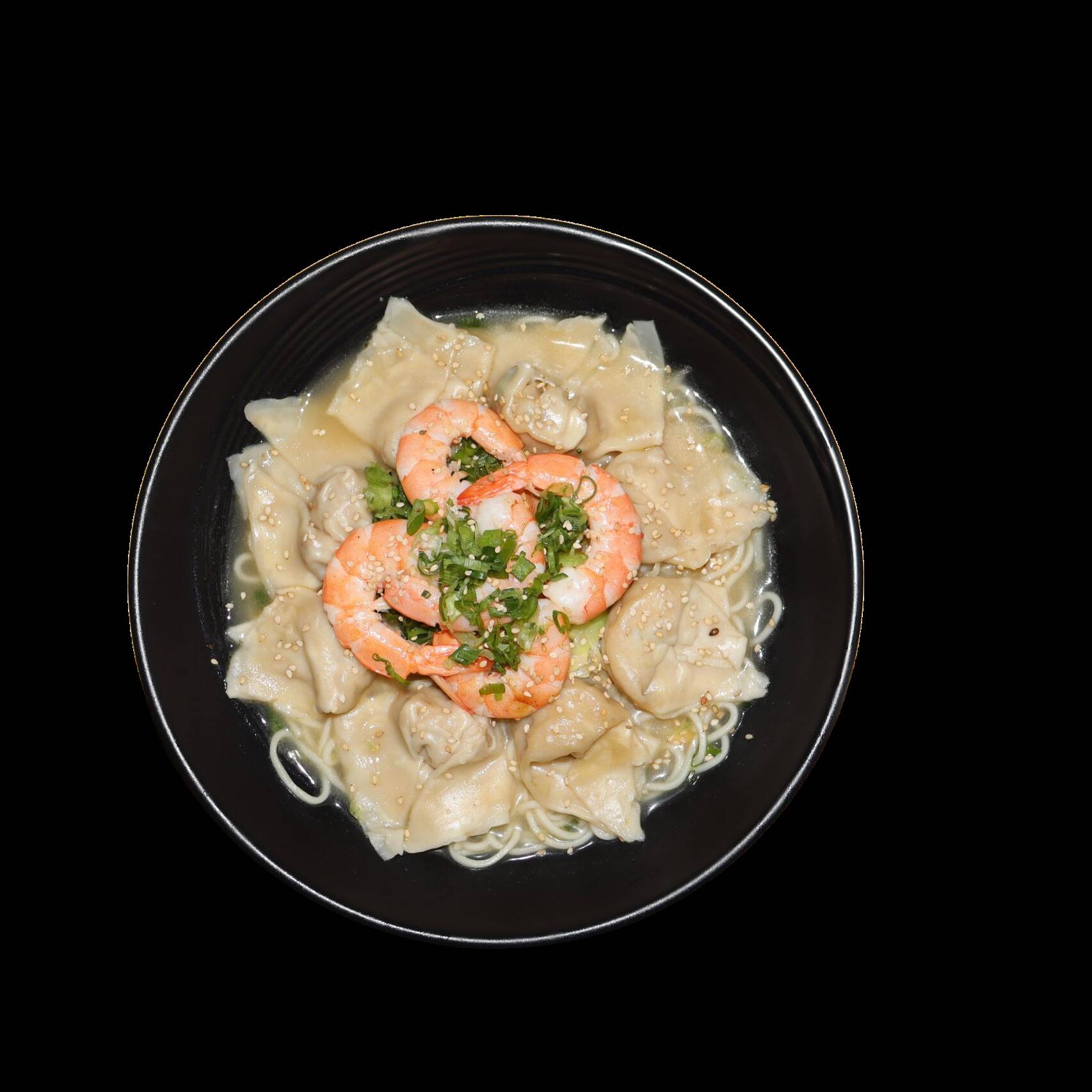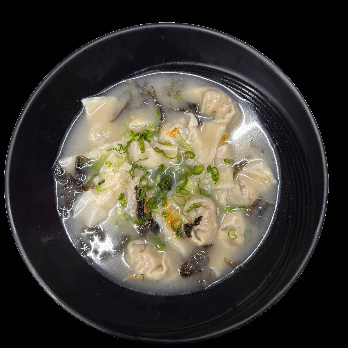 Caldo base de mariscos, wontons rellenos de carne de puerco, camarón seco, alga comestible y cebollín.