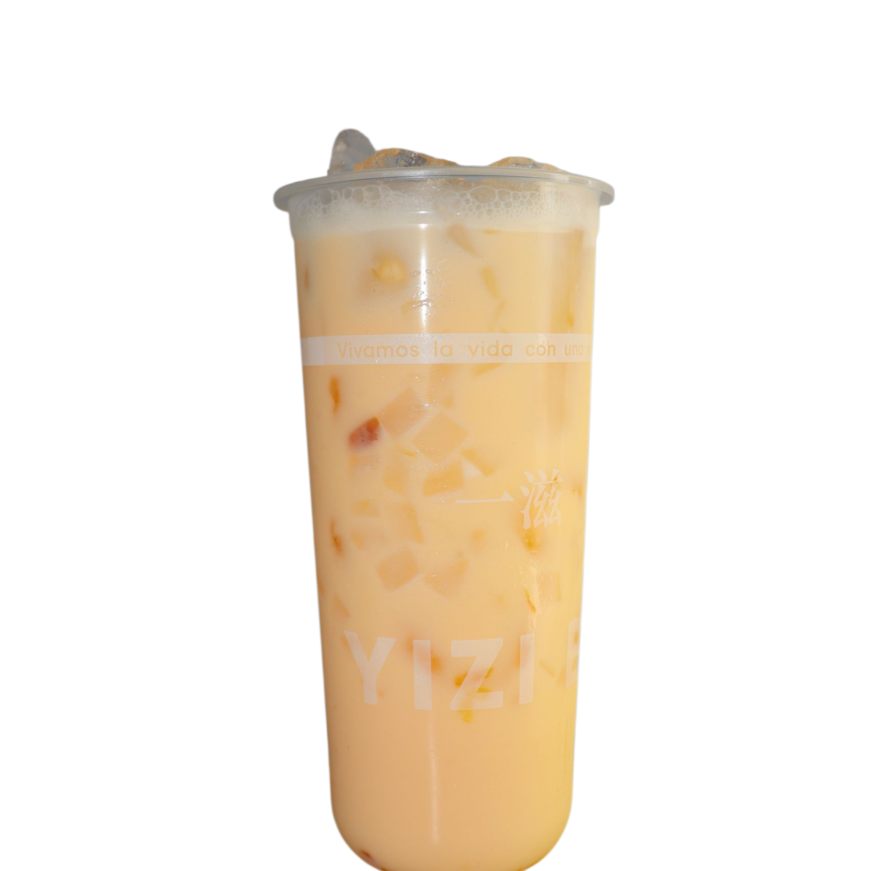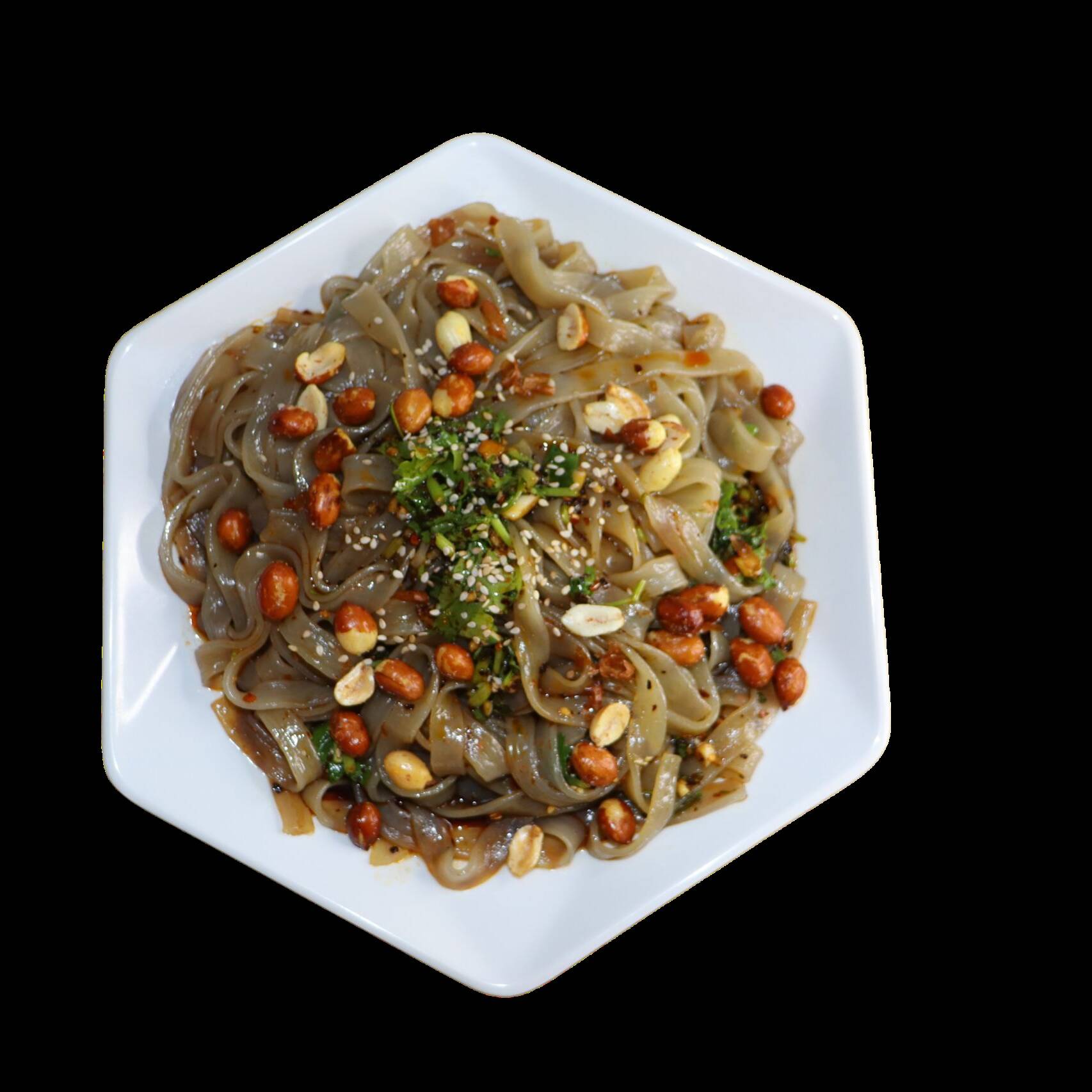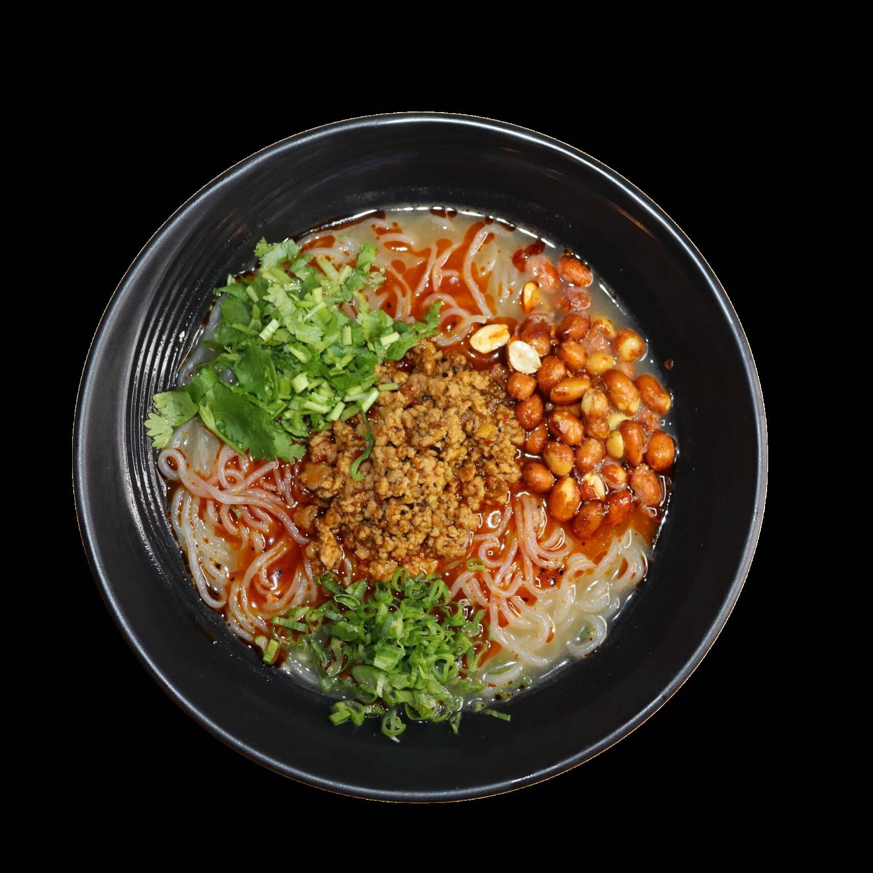 Caldo condimentado a base de chiles y especias, fideo de camote con textura, picada de puerco, cacahuates, cebollín y cilantro.