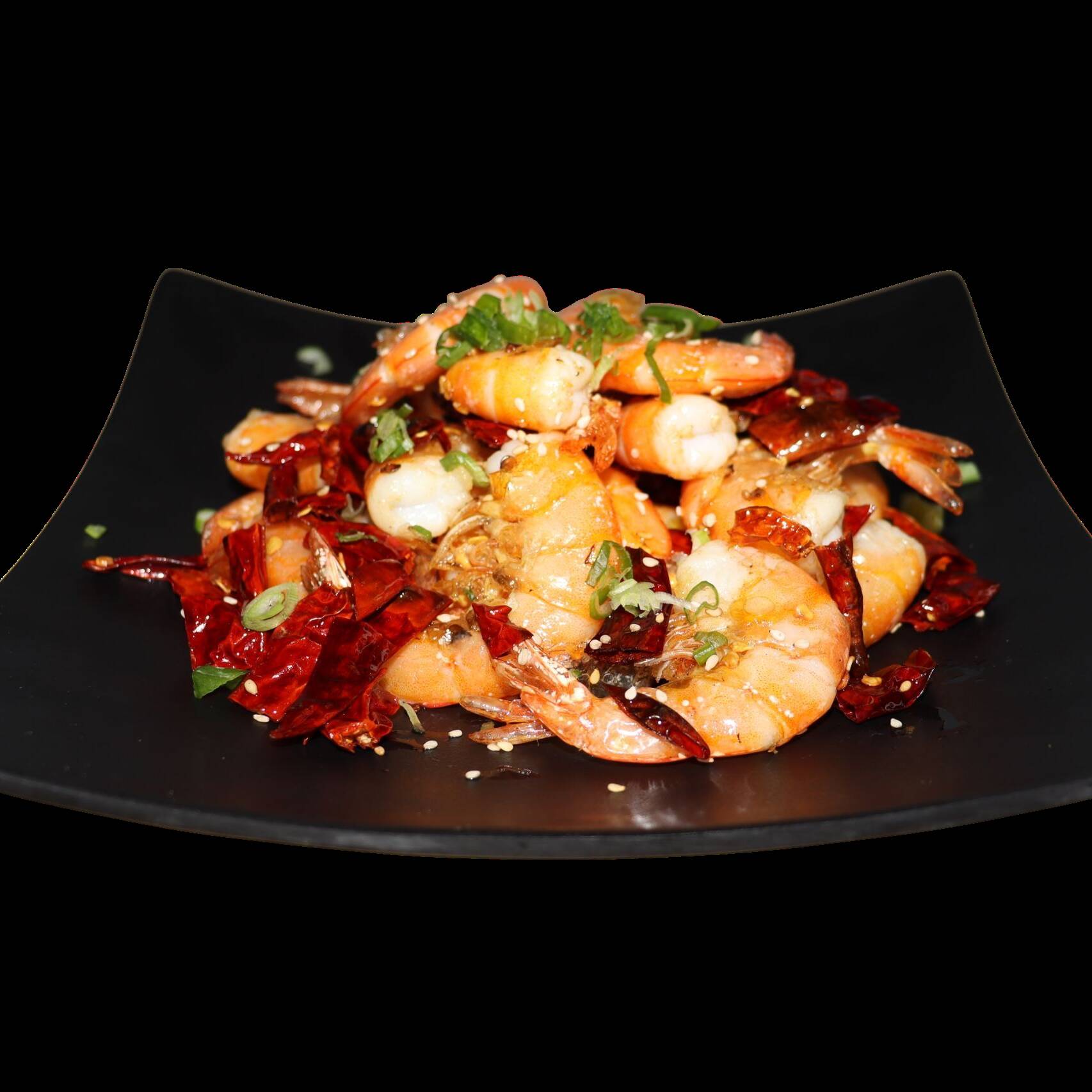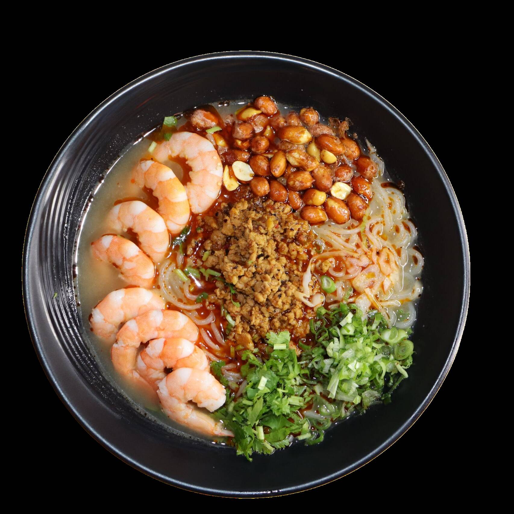 Caldo condimentado a base de chiles y especias, fideo de camote con textura, picada de puerco, camarones, cacahuates, cebollín y cilantro.