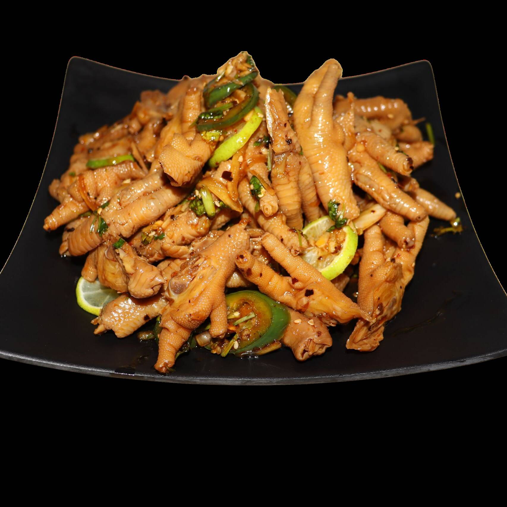 Pata de pollo con rica salsa especial,ajo,chile jalapeño,pulpa de maracuya,cebollín y cilantro