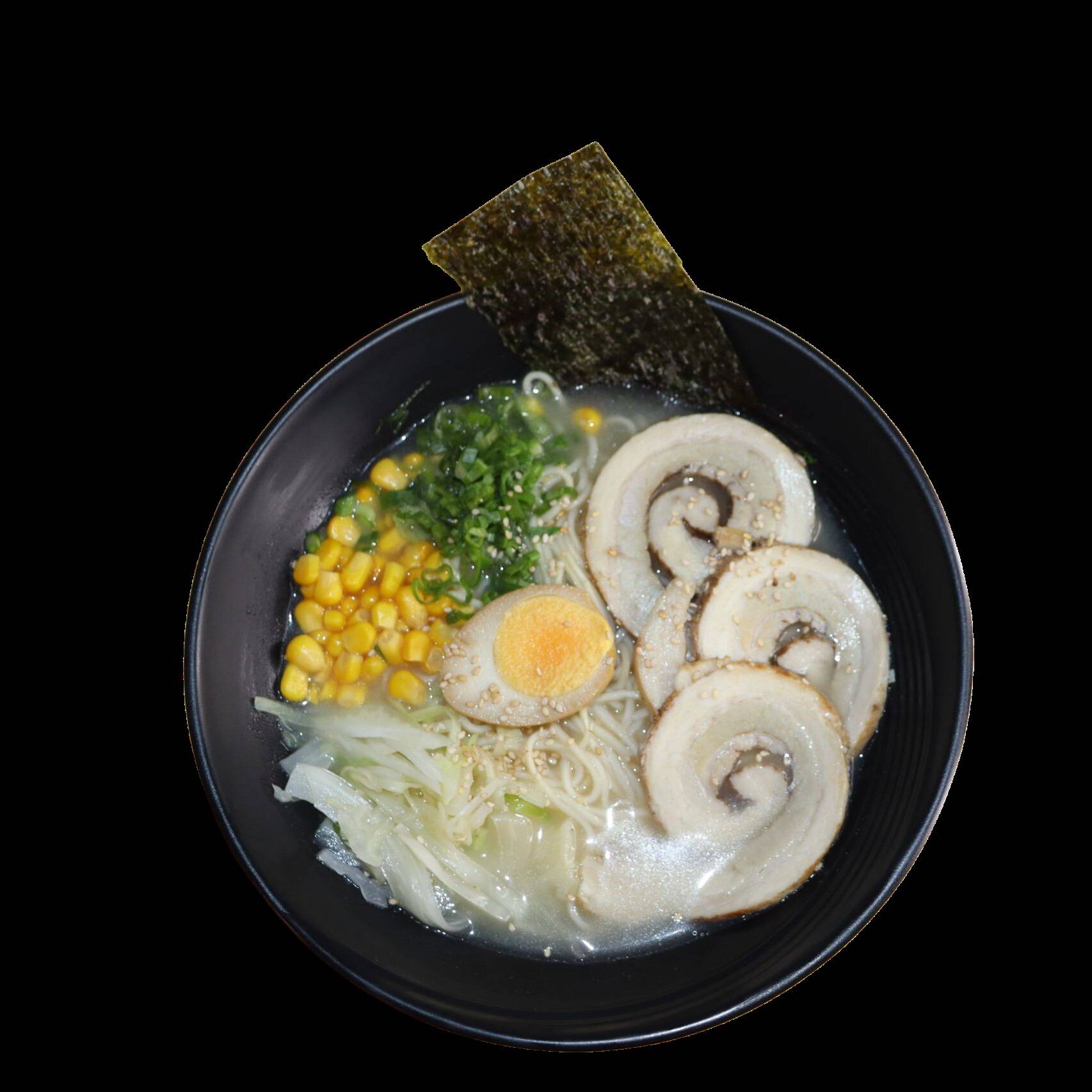 Tocineta de puerco, alga, huevo, col, elote y cebollín.
