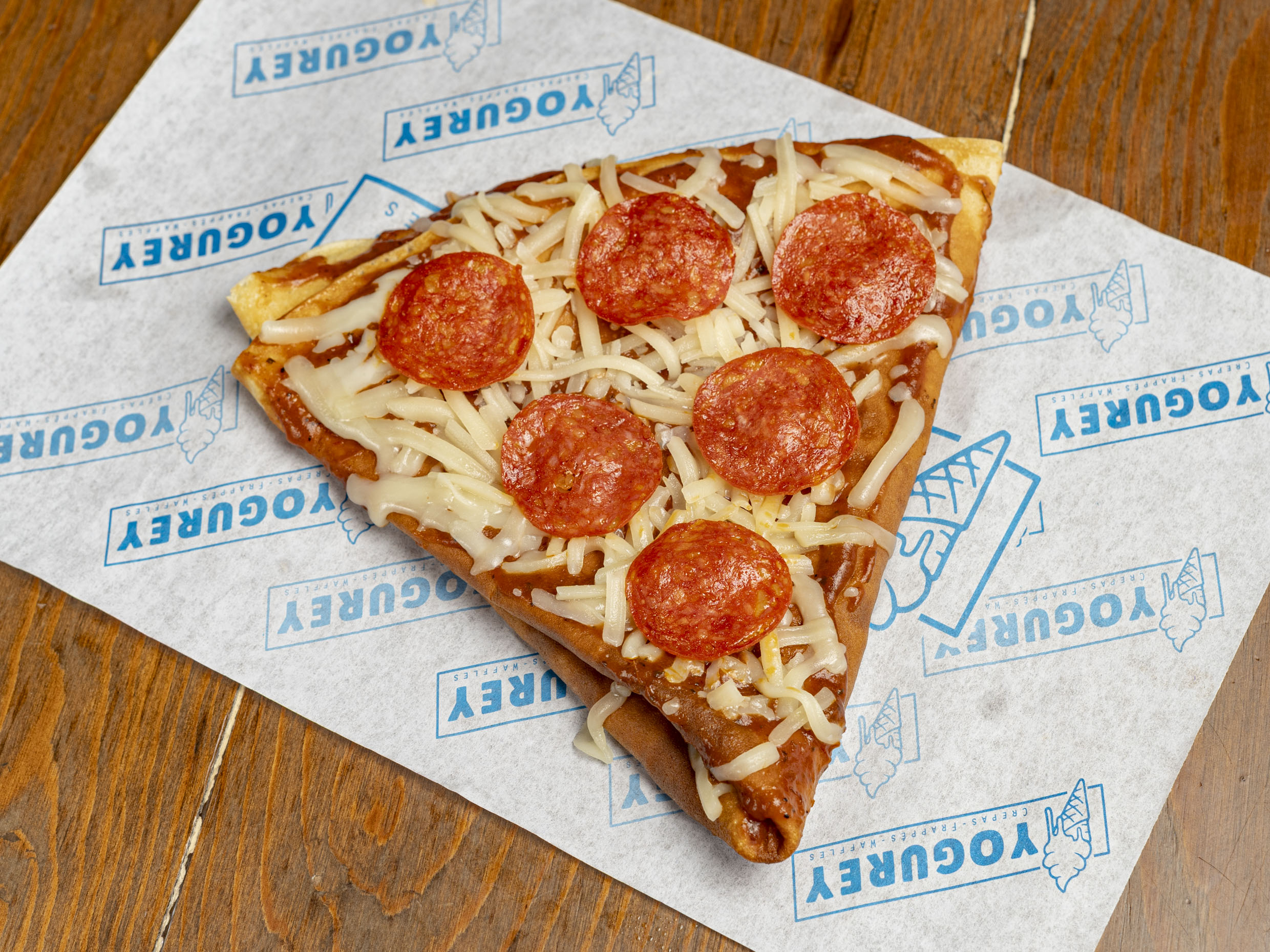 Crepa con salsa de tomate, queso manchego y pepperoni, acompañada de un rico aderezo de chipotle.