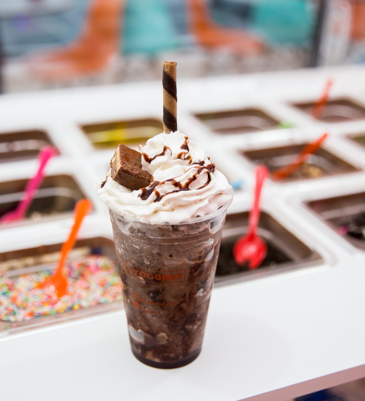 Incluye crema chantilly, 1 barquillo, chocolate liquido Hershey´s , acompañado de un chocolate Ferrero.
