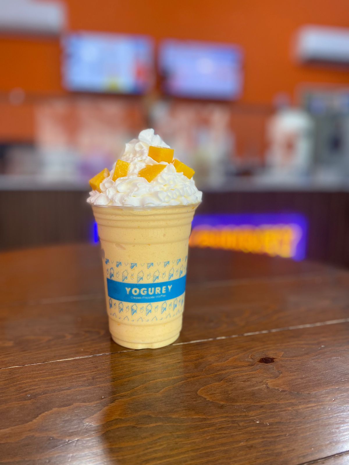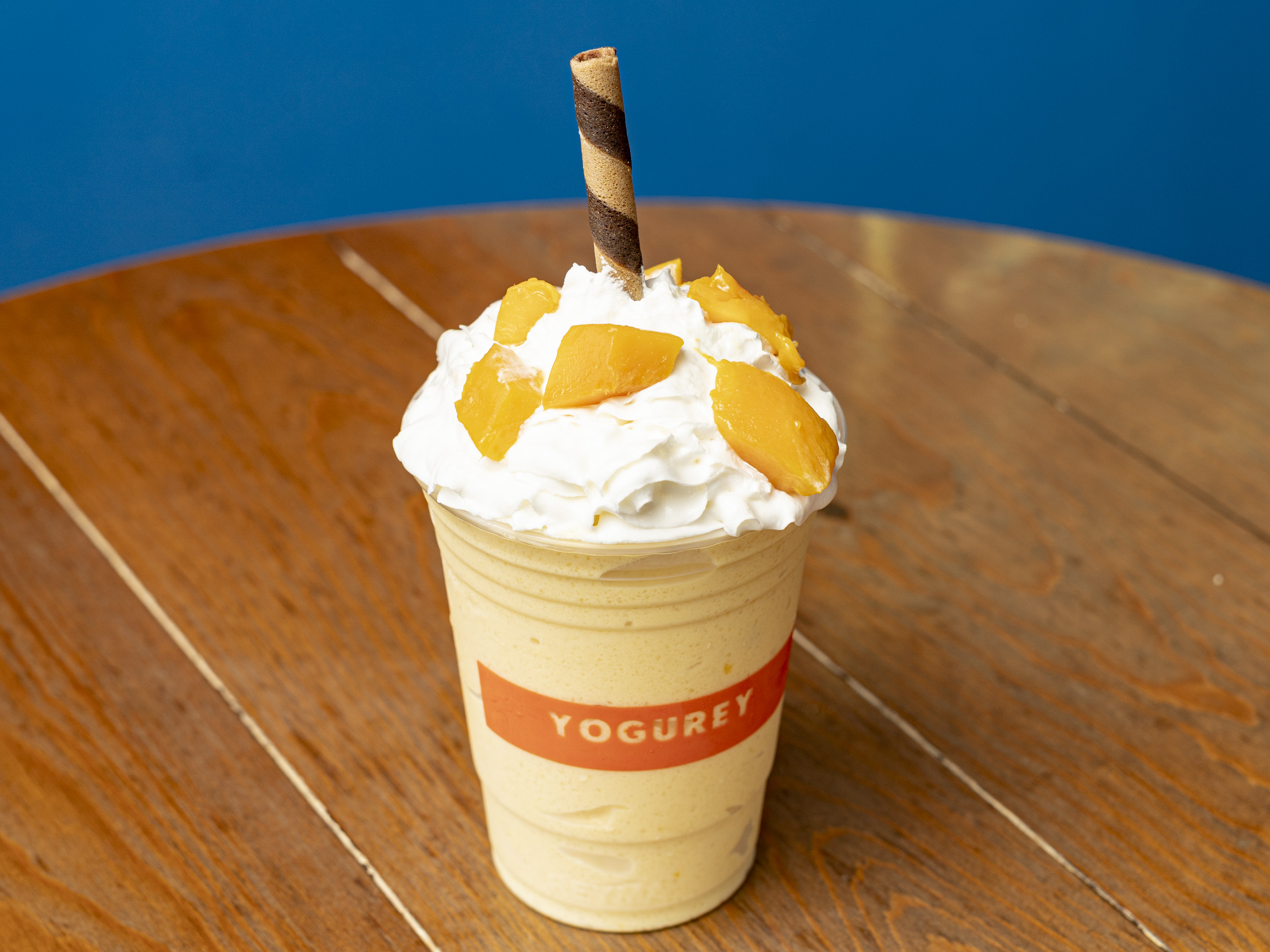 Smoothie sabor Mango con Yogurt, acompañado de crema chantilly y barquillo de chocolate