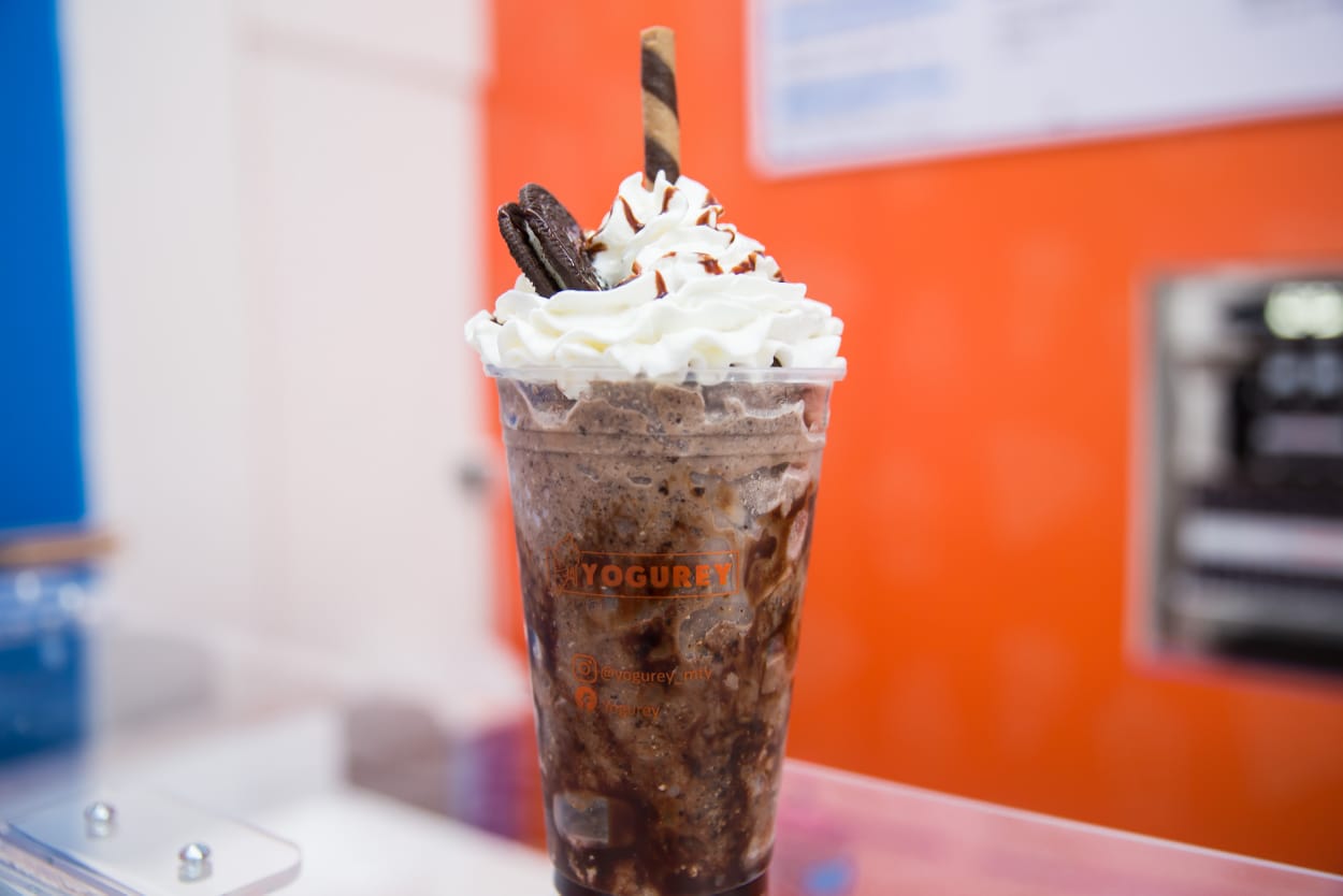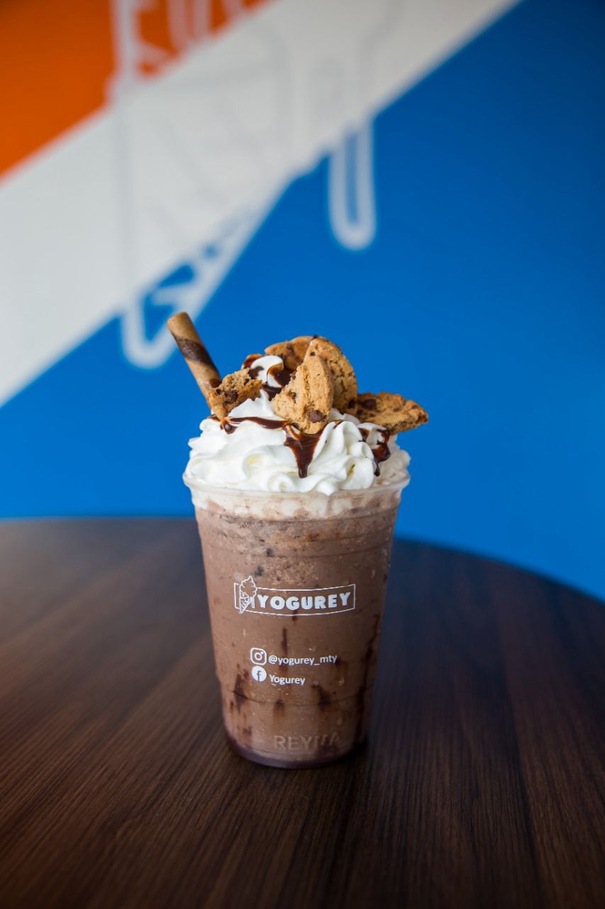 Frappé, acompañado de crema chantilly, chocolate, un barquillo y una galleta oreo, preparación a elección.