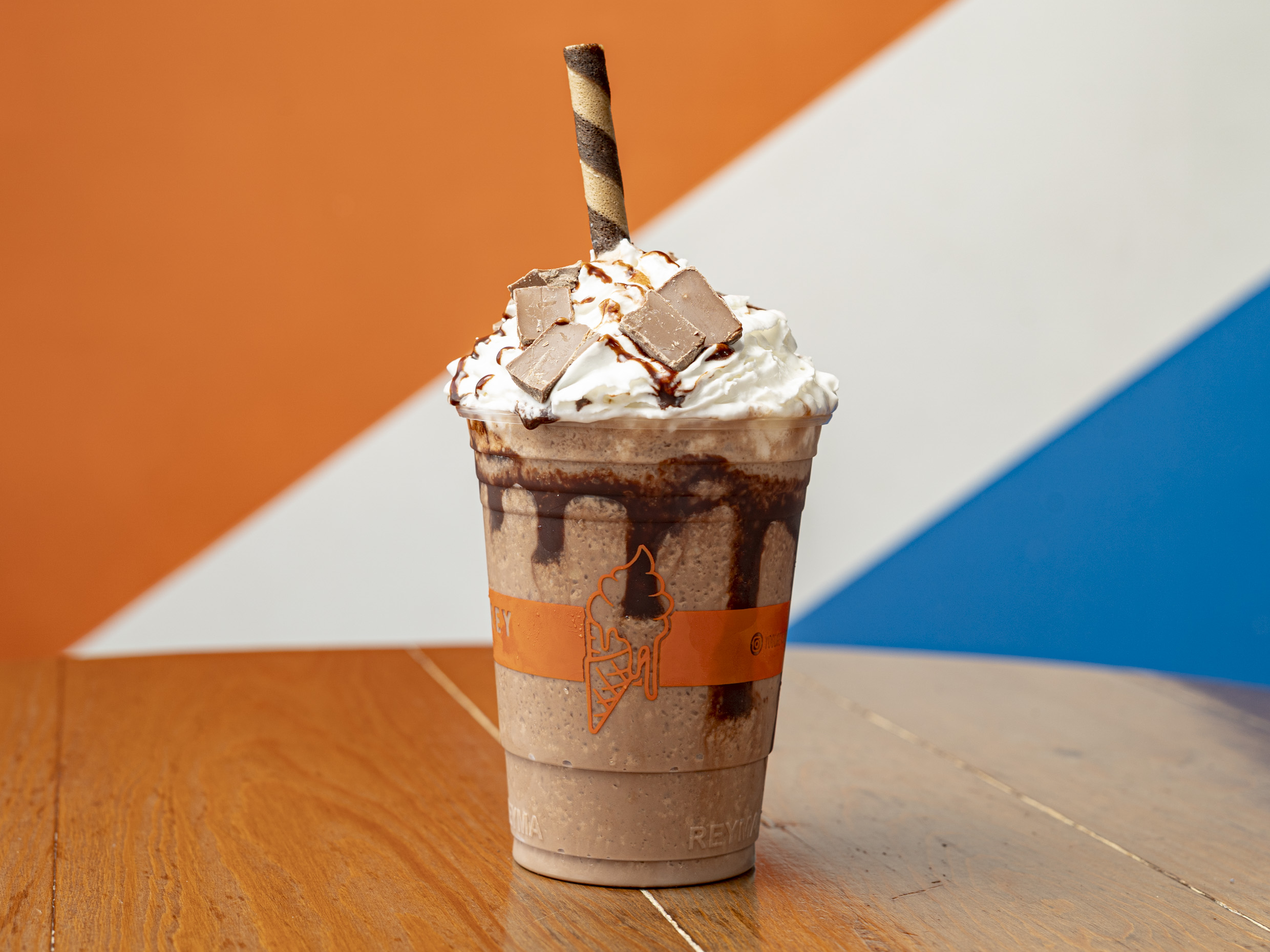 Frappé acompañado de crema chantilly, chocolate y un barquillo.