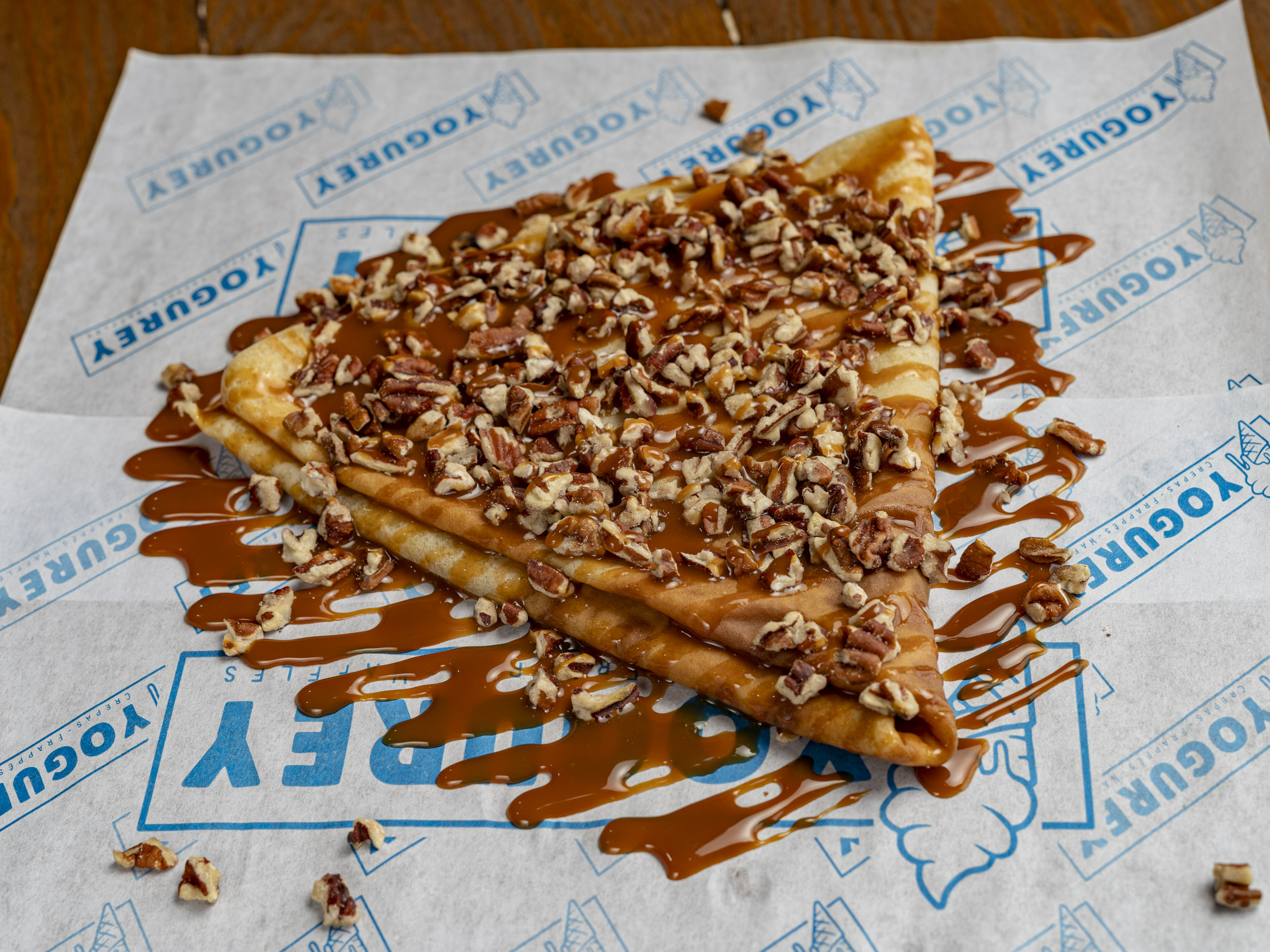 Crepa rellena de cajeta, bañada en cajeta y nuez.