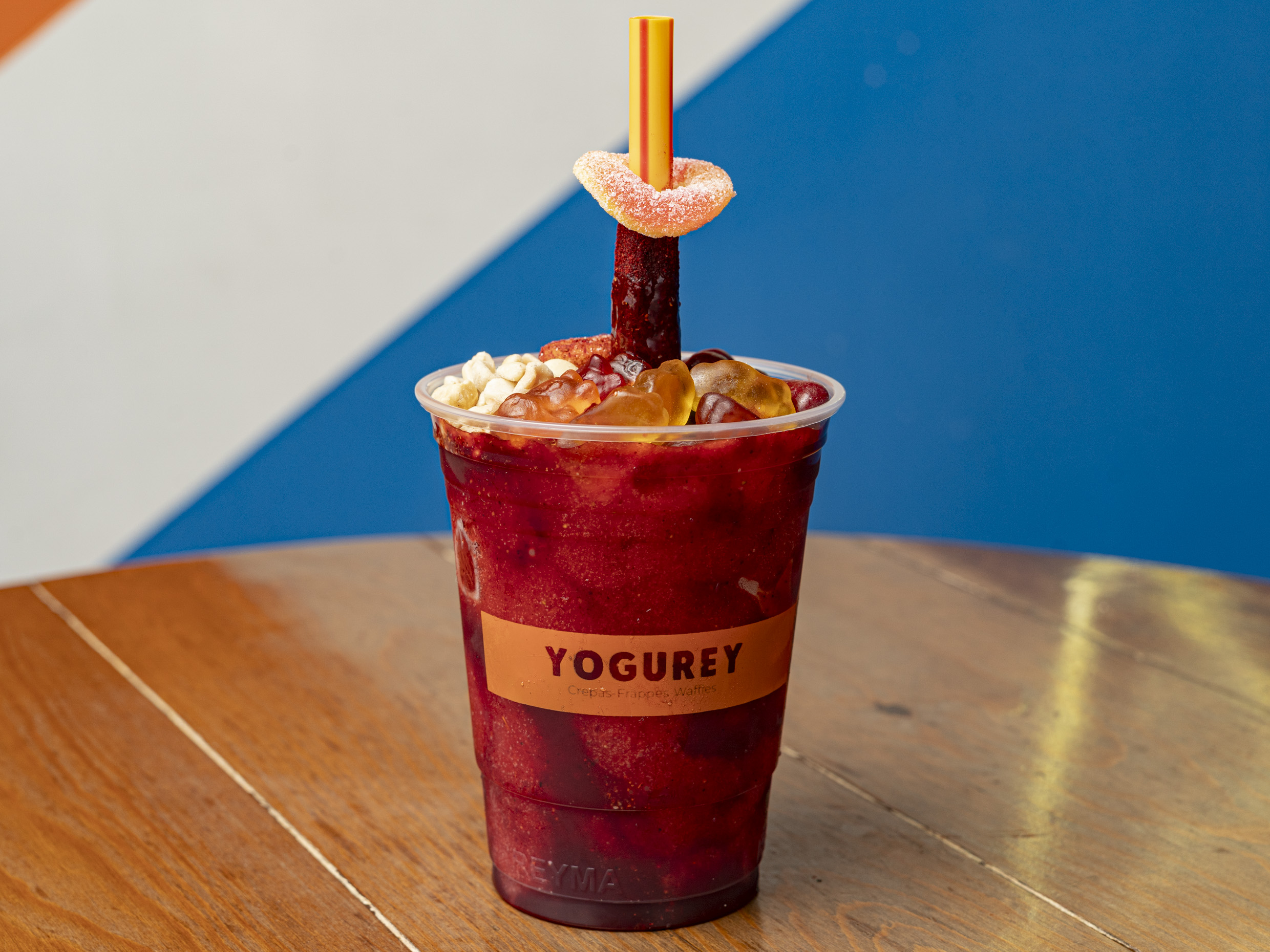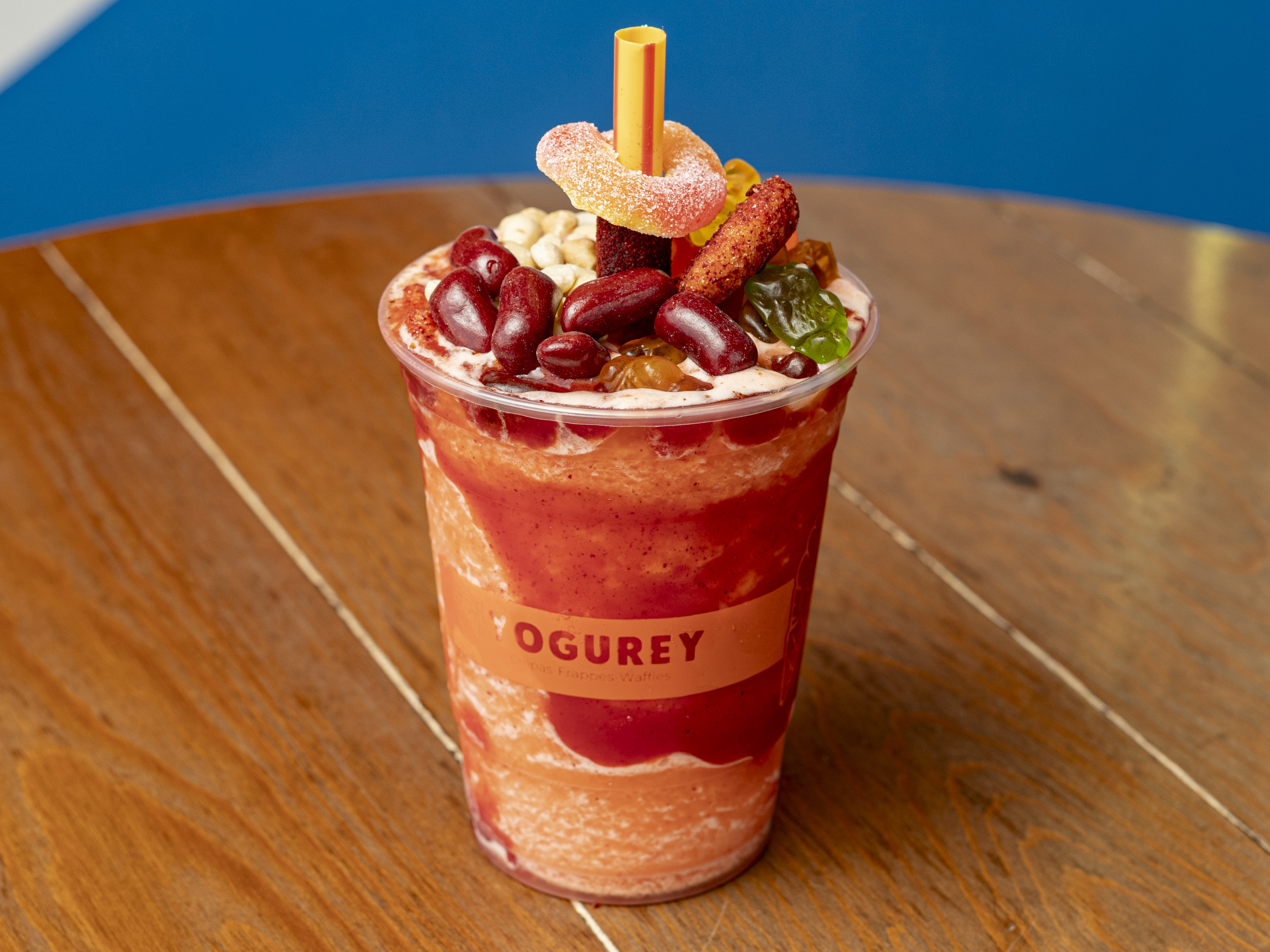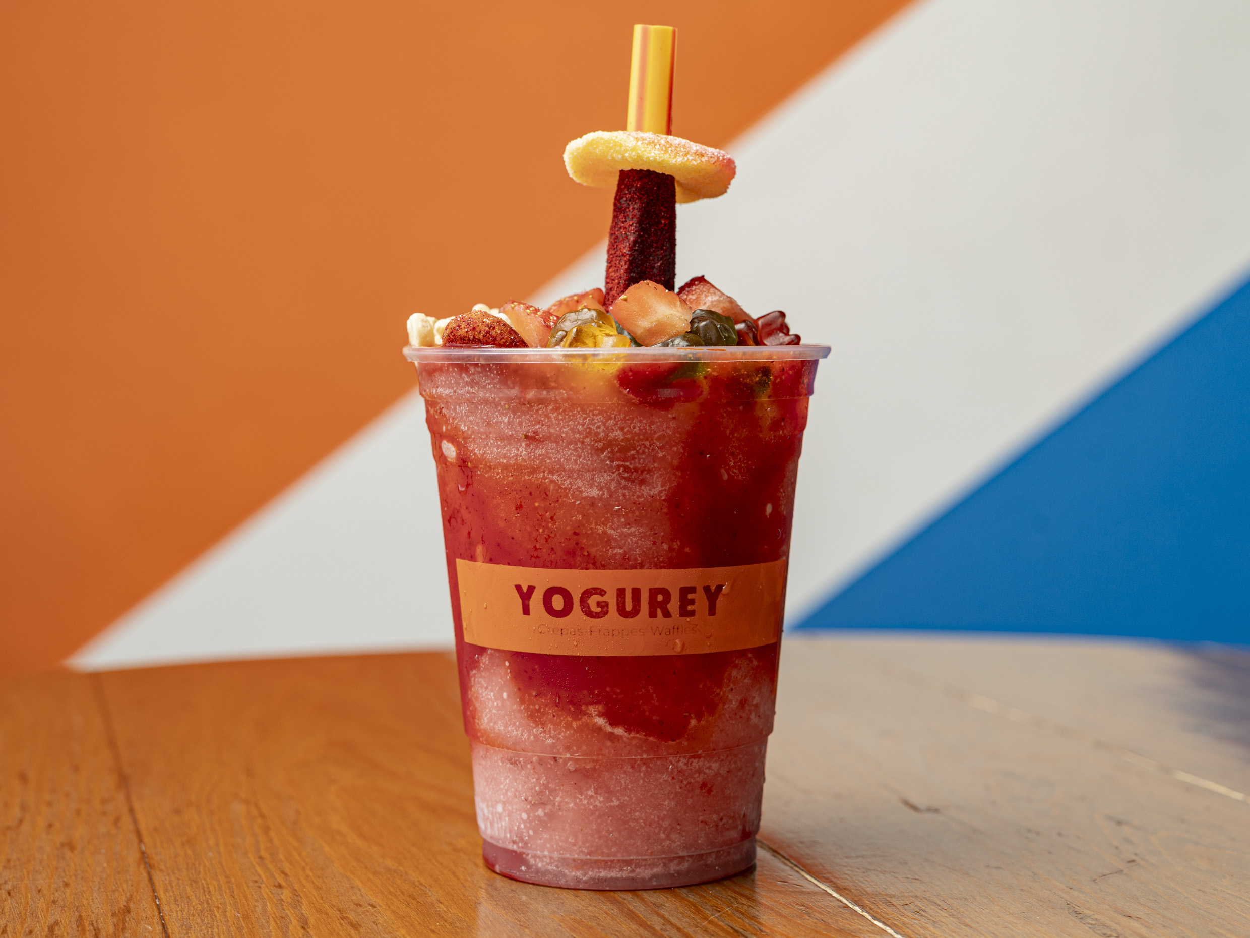 Smoothie de fresa en agua, acompañado de con gomitas.