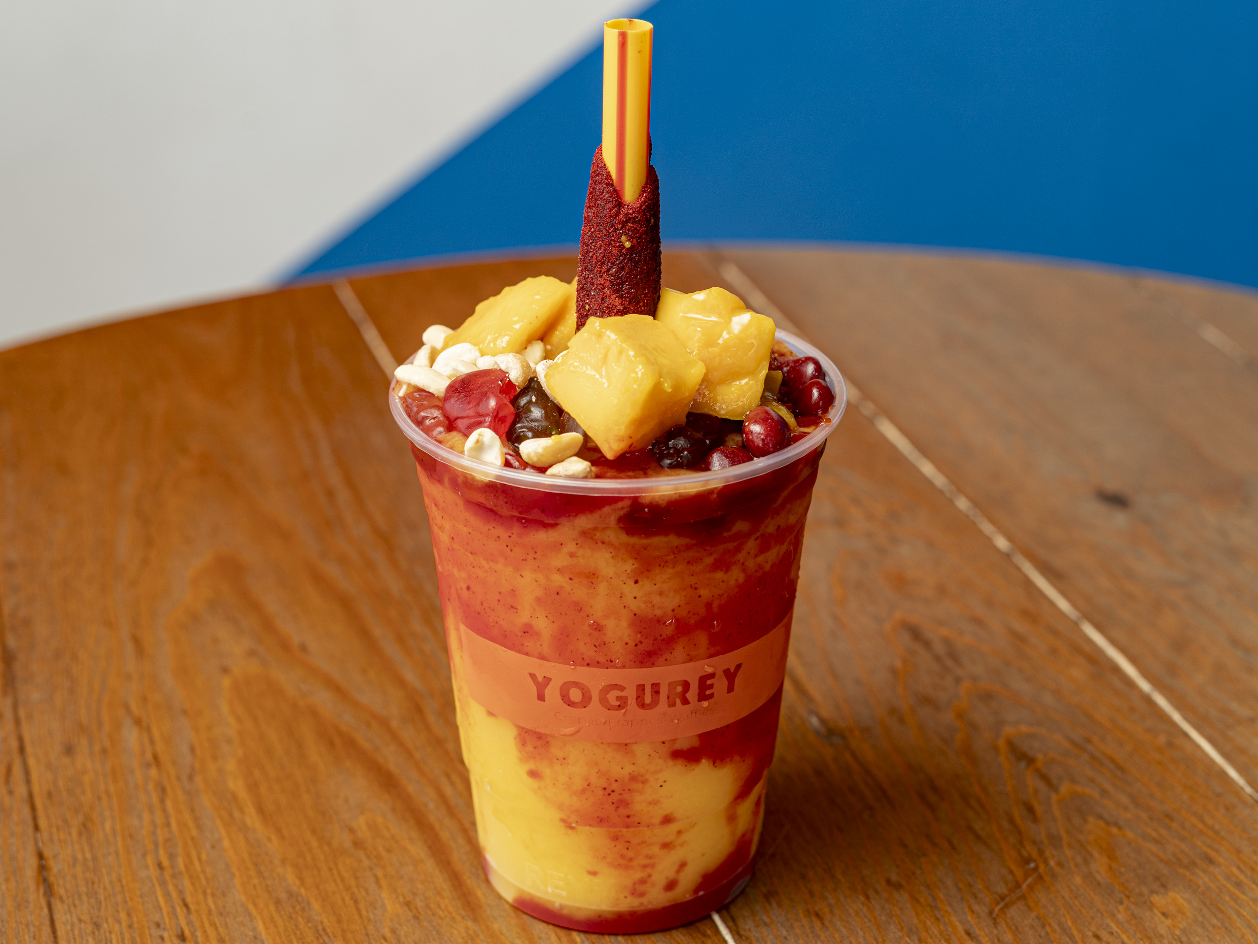 Smoothie de mango natural, chamoy, chile en polvo, tarugo, gomitas, golos y cacahuate japones.