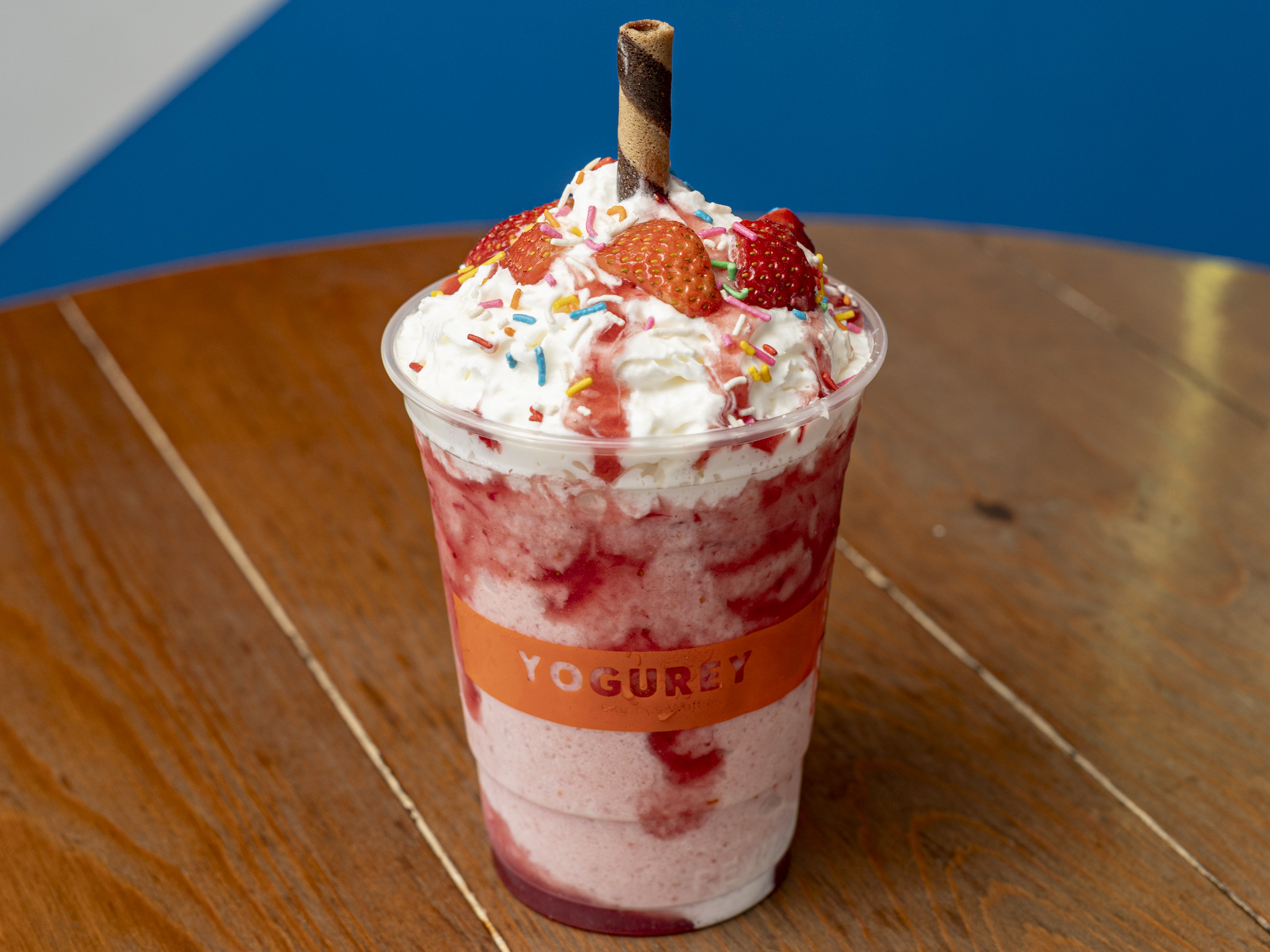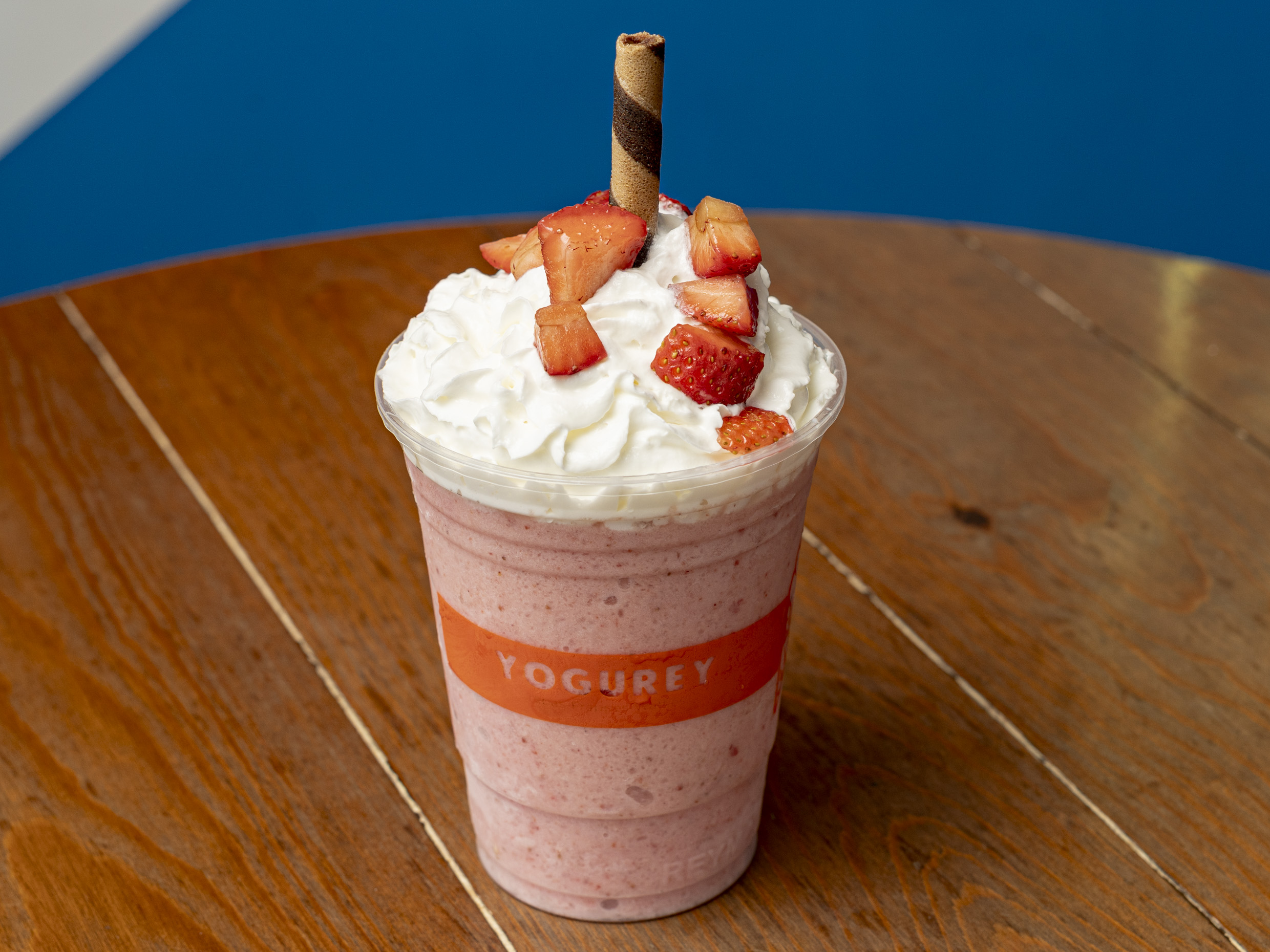 Smoothie sabor Fresa con Yogurt, acompañado de crema chantilly y barquillo de chocolate
