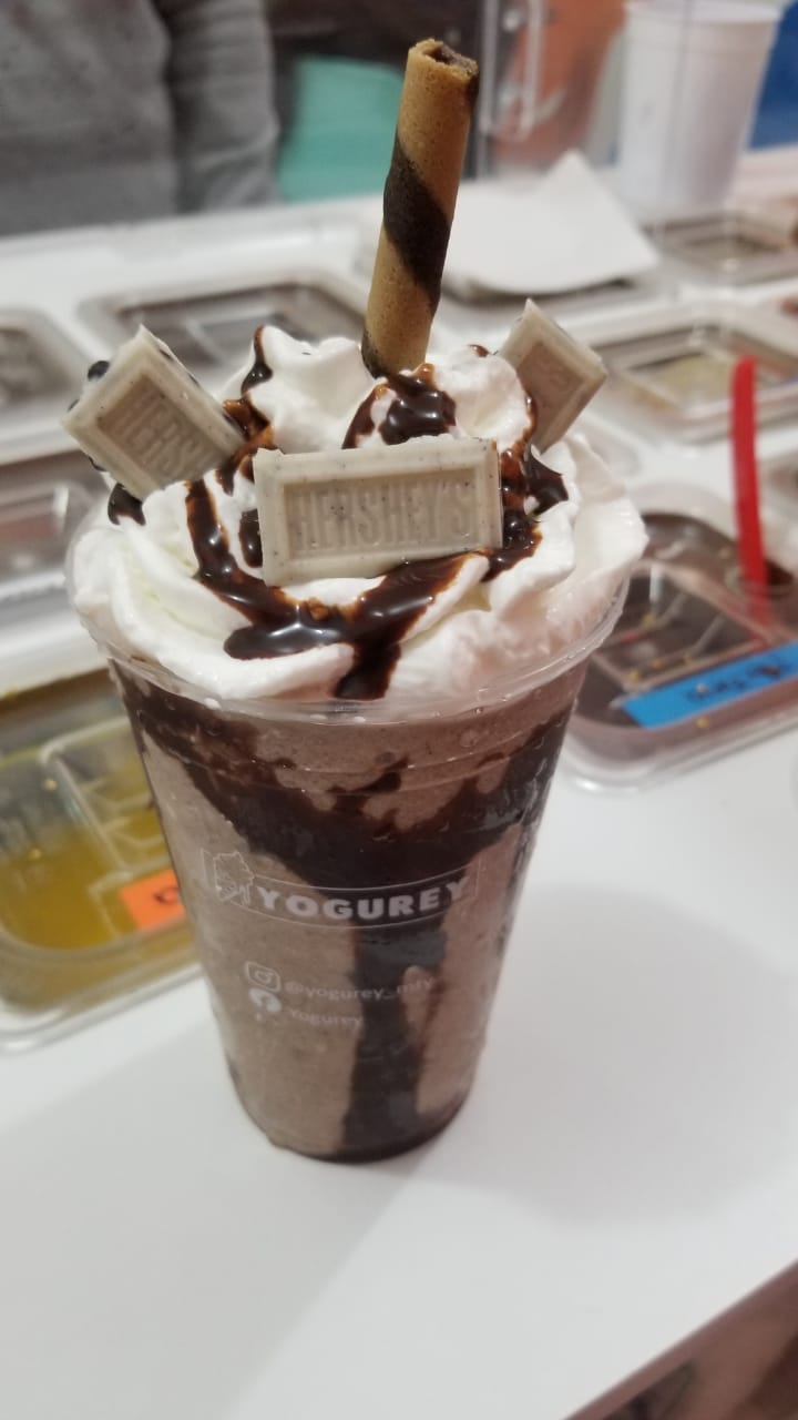 Acompañado de crema chantilly, chocolate, 1 barquillo y chocolates cookies and cream.
