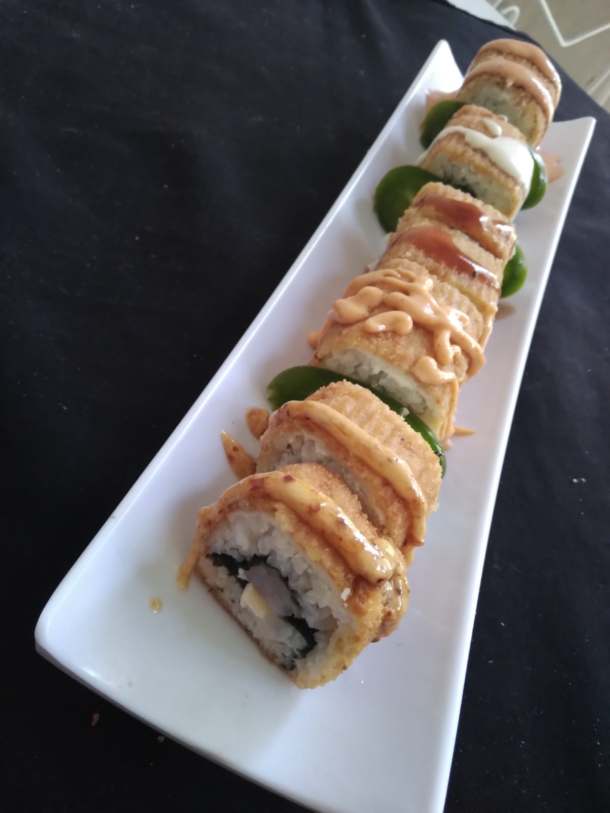 Arroz frito, pollo empanizado, aguacate, chipotle, cebollín, queso Philadelphia y chipotle.
