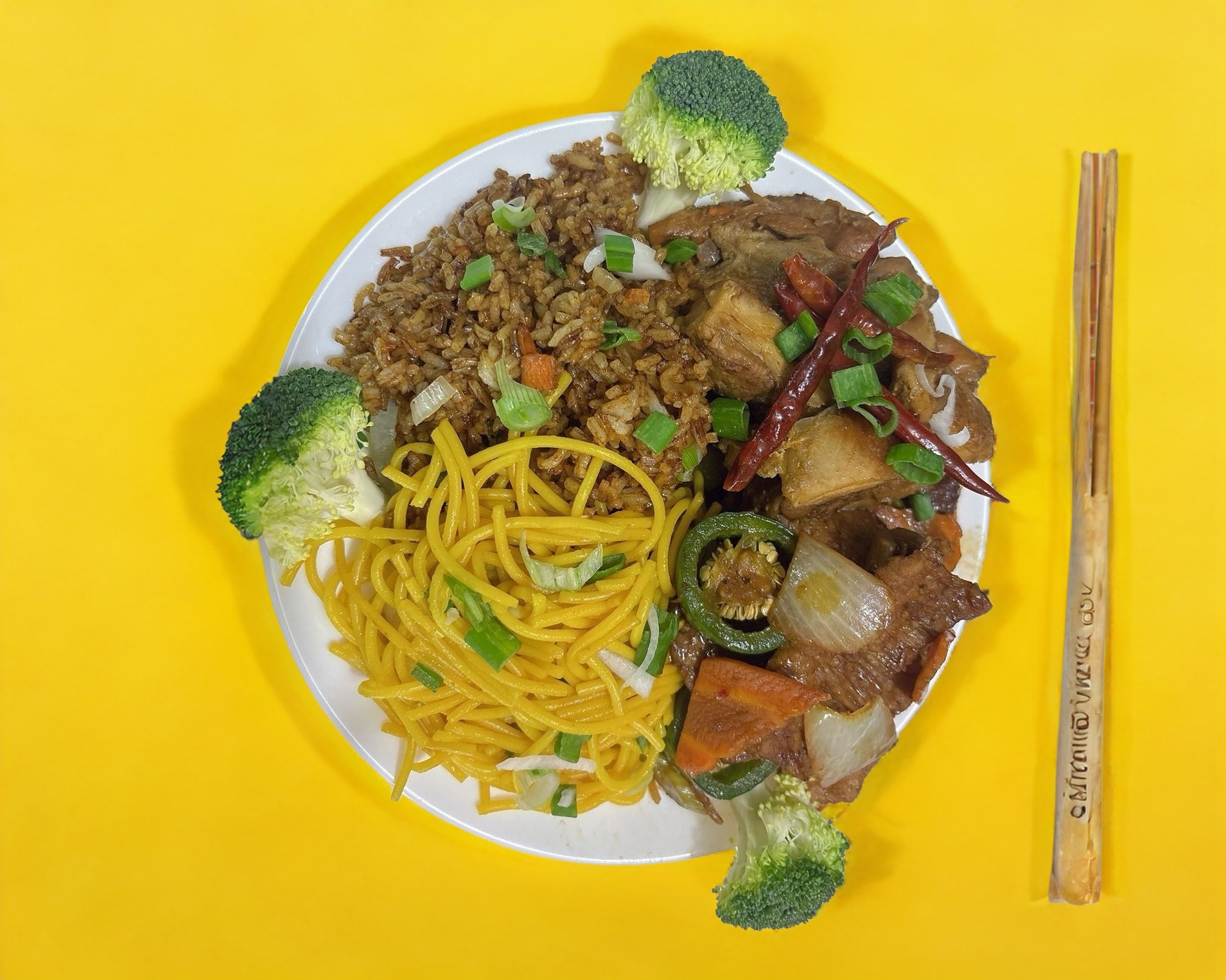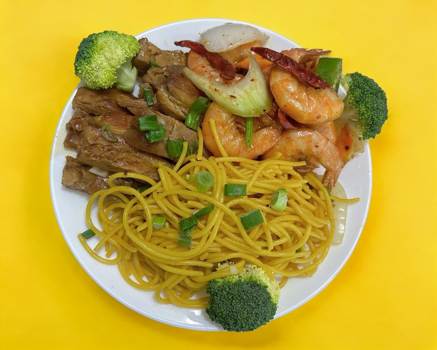 Arroz o pasta, camarón, 2 guisos a elegir.