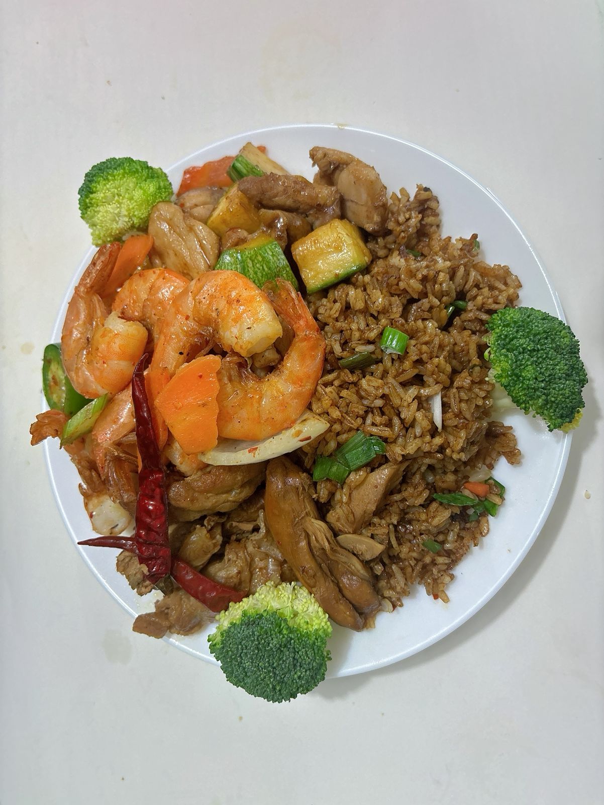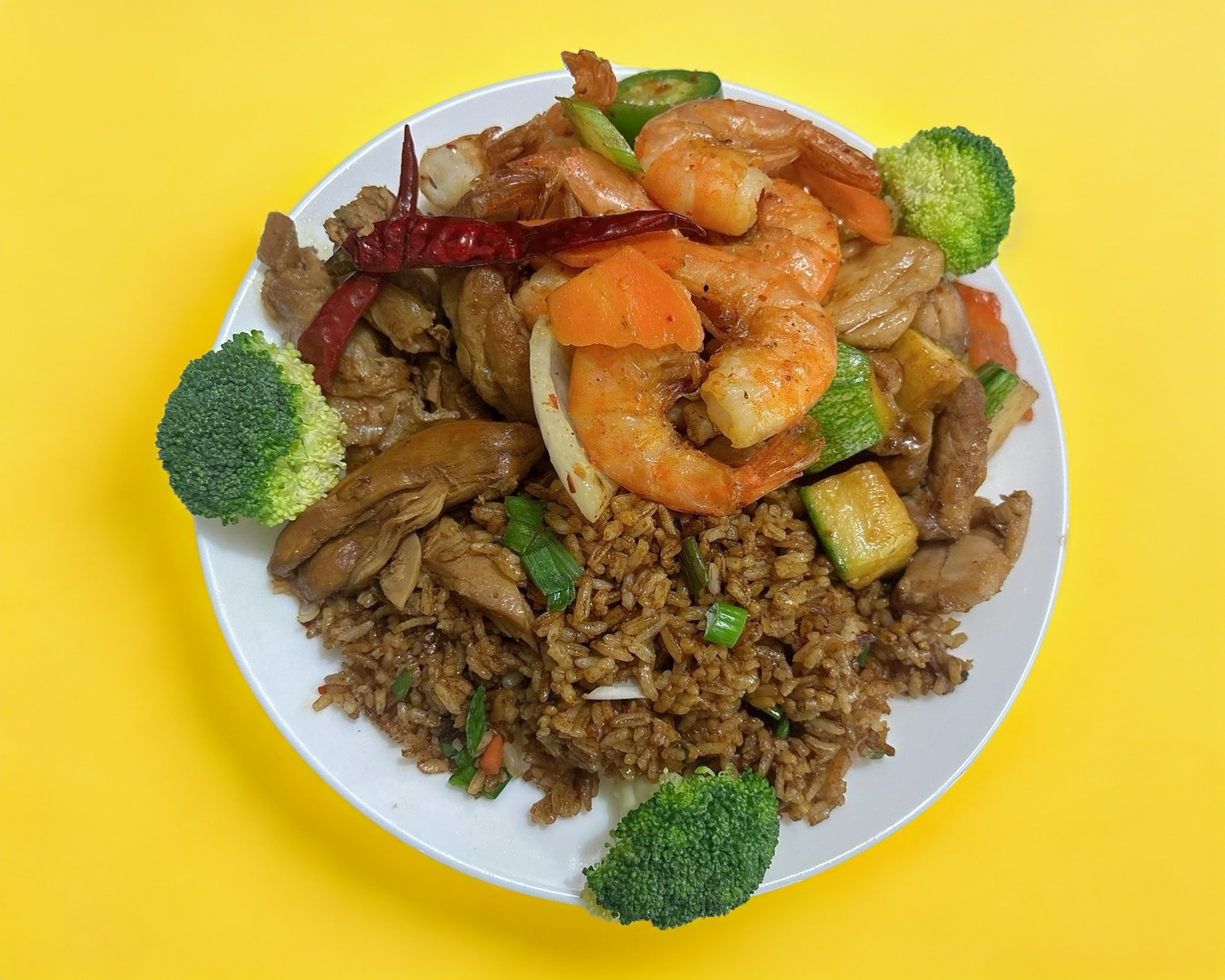 Arroz o pasta, camarón, 1 guiso a elegir.