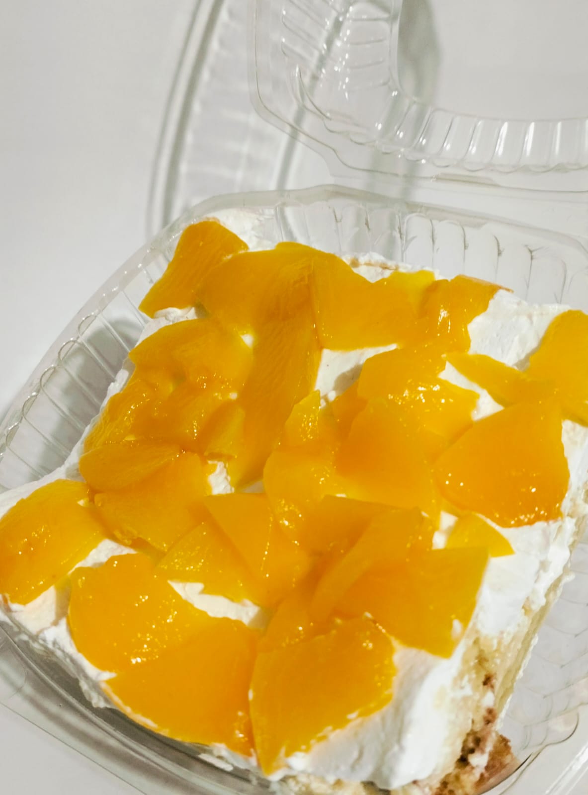 Delicioso pastel mojadito con leches, cubierto de chantilly y durazno.