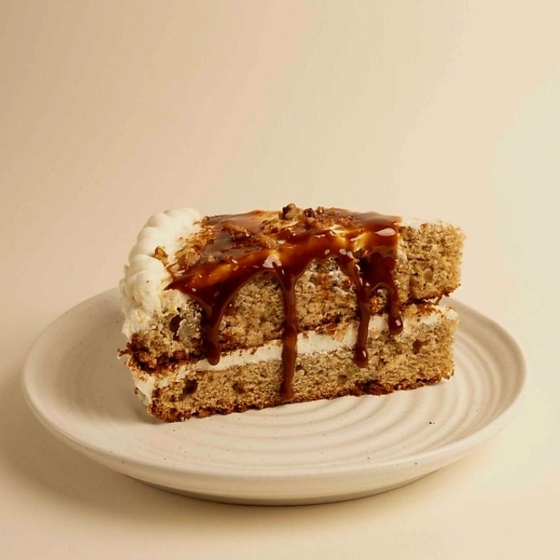 Pastel casero de plátano, con cubierta y relleno de betún de queso crema con cajeta y nuez.