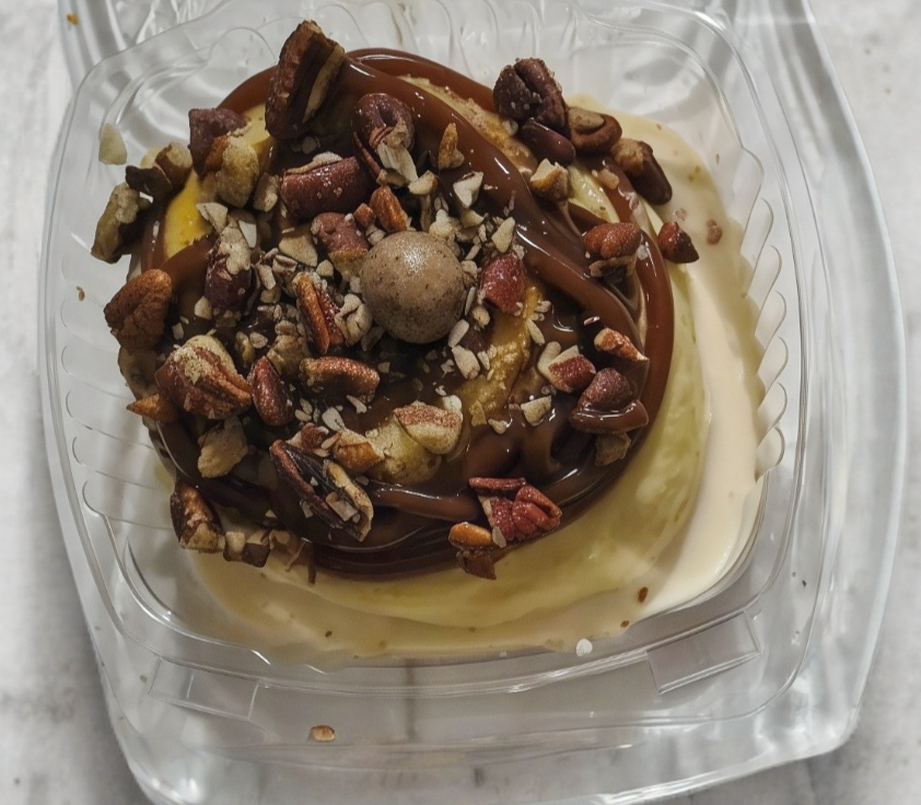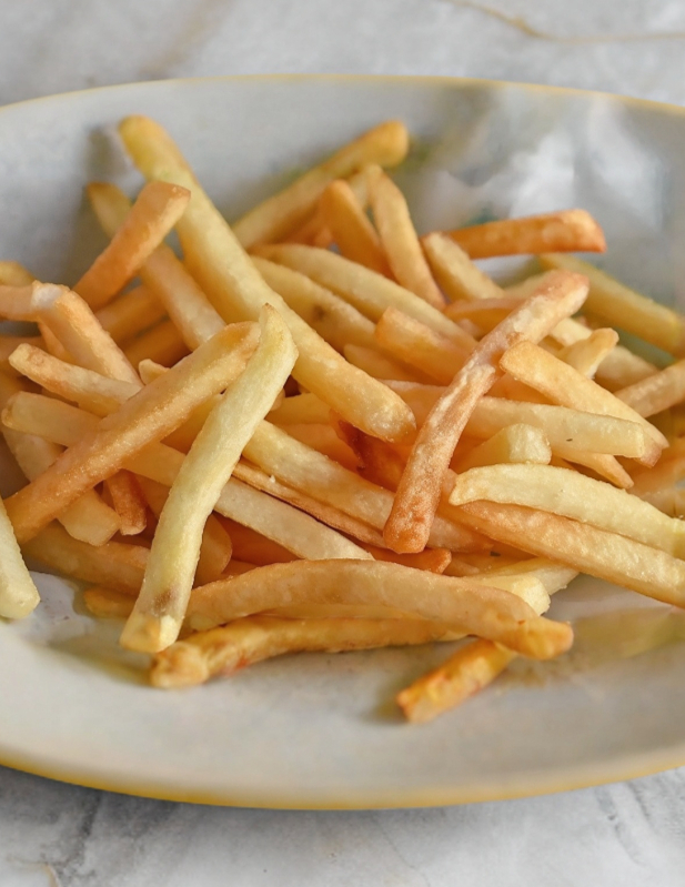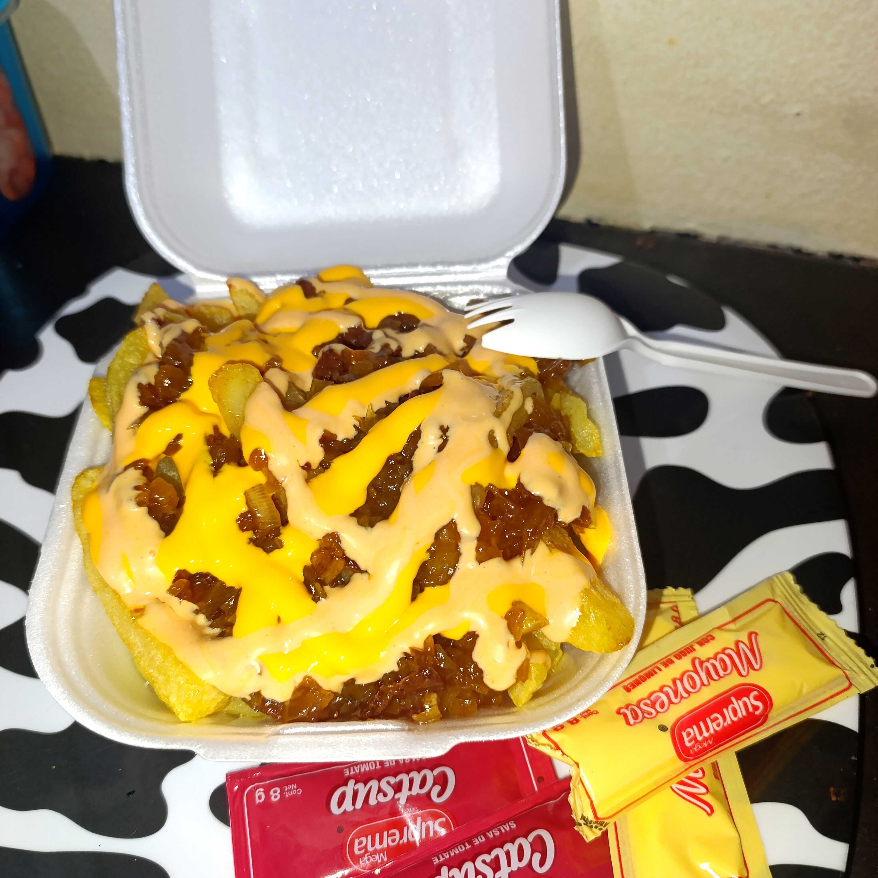 Papas a la francesa, especias caseras, queso amarillo y mermelada de tocino.