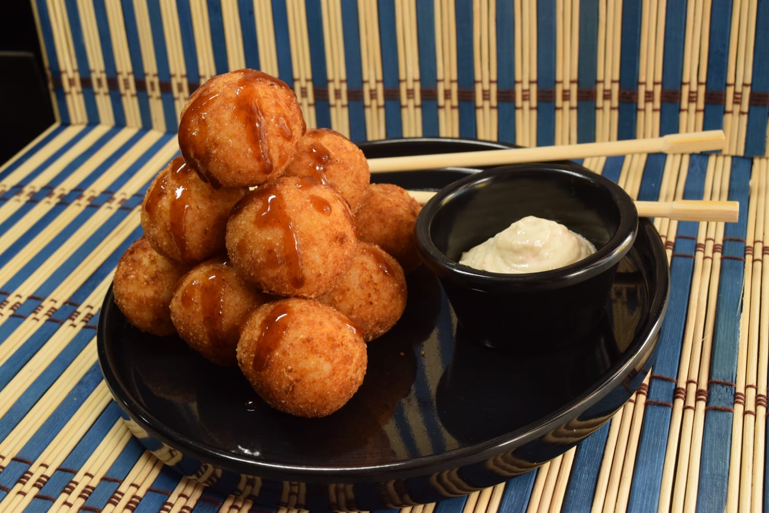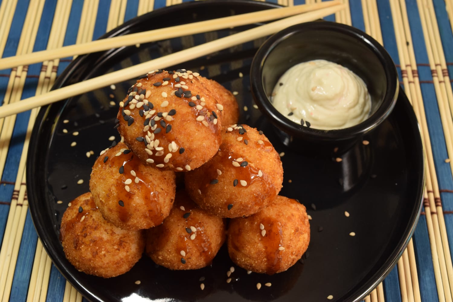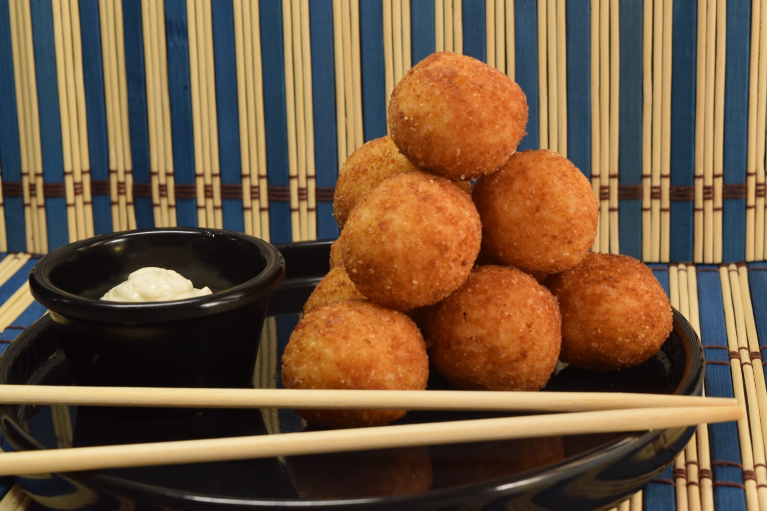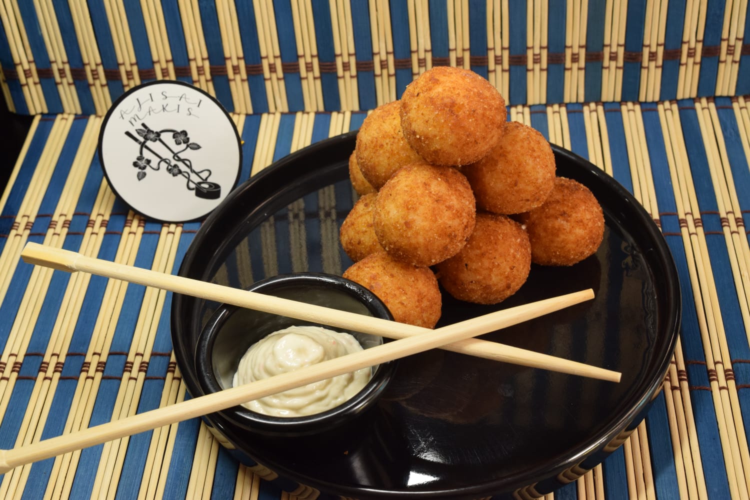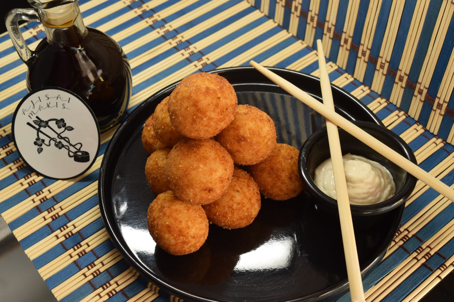 Orden de 10 bolitas de arroz rellenas de manchego y Philadelphia empanizadas.