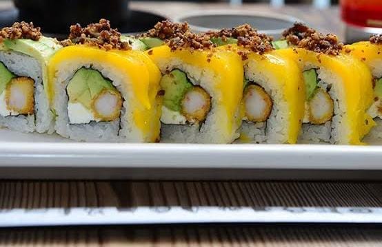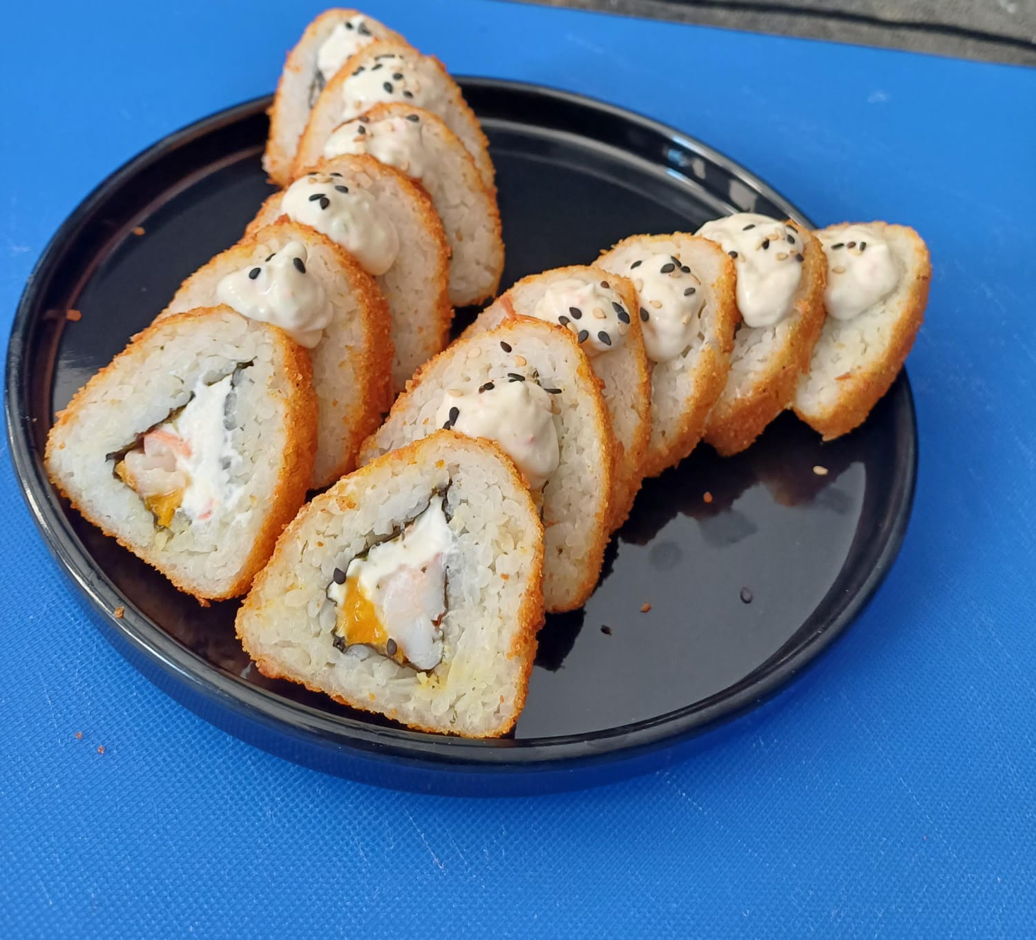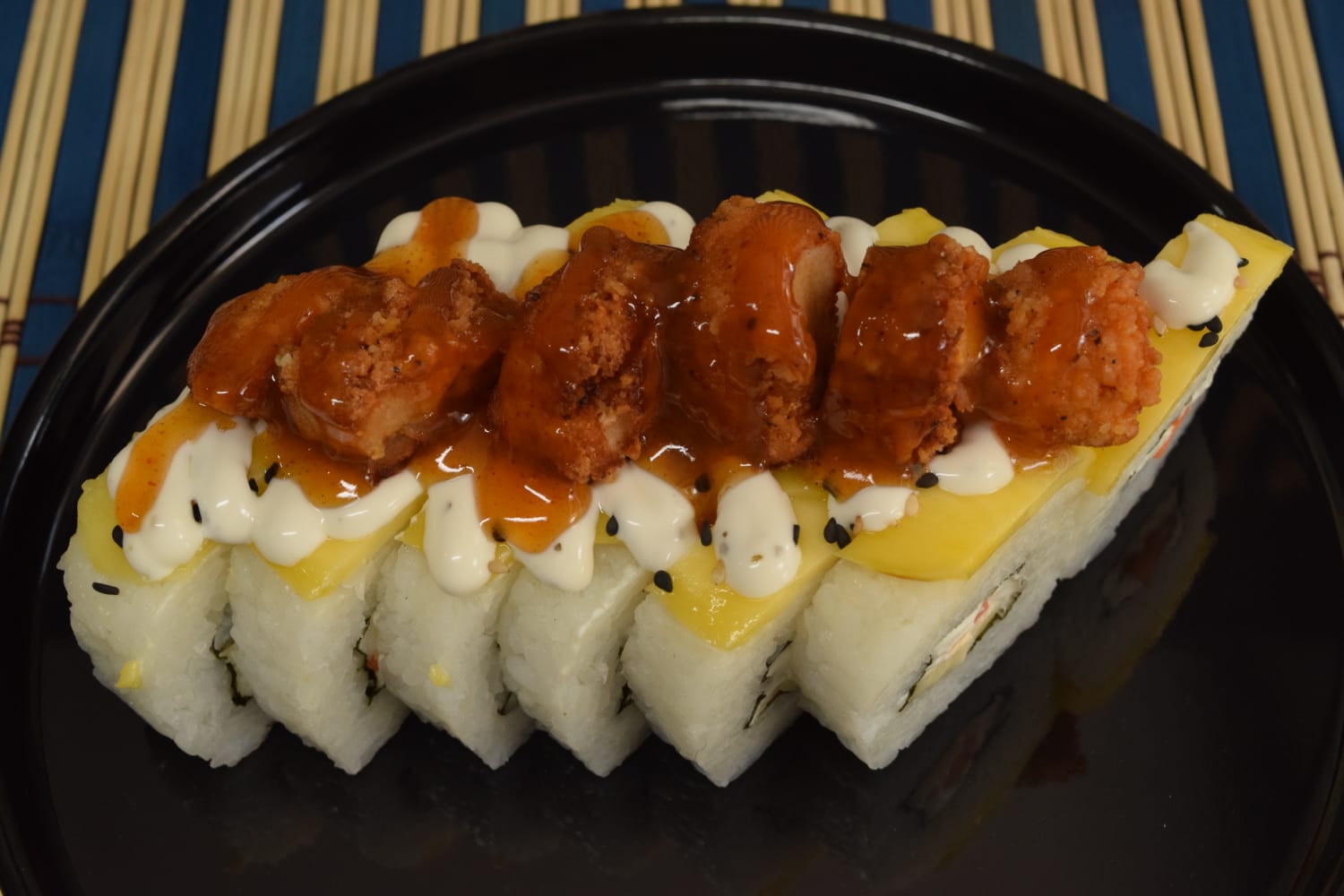Rollo de arroz y alga con Philadelphia, camarón y mango empanizado en coco, incluye tampico.