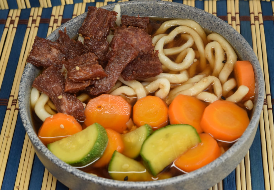Caldo con pasta gruesa de trigo, con verduras y arrachera.