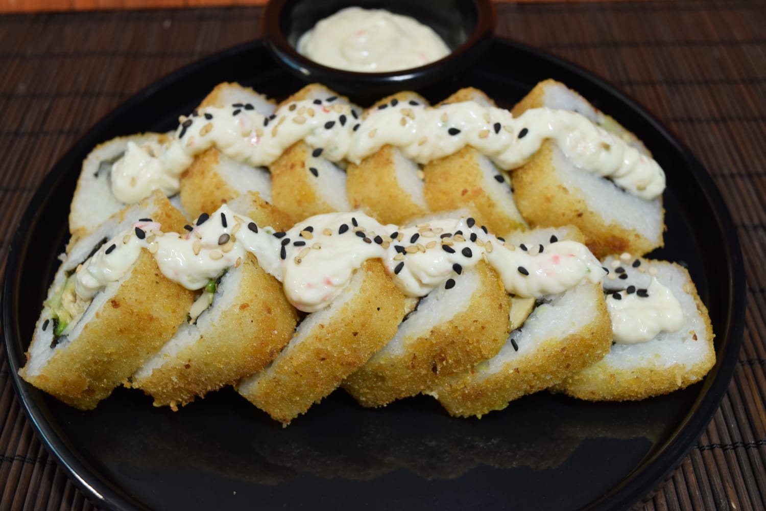 Rollo de arroz y alga con Philadelphia, manchego, zanahoria, boneless encima, acompañado de aderezo ranch.