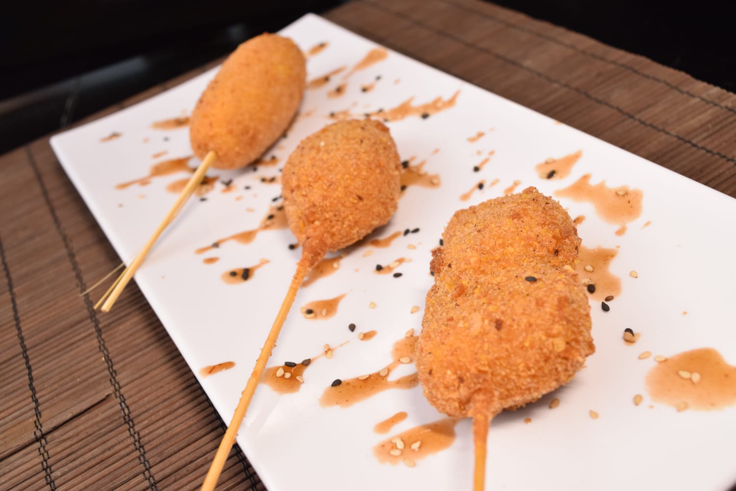 Orden de 10 bolitas de arroz rellenas de camarón y Philadelphia empanizadas.