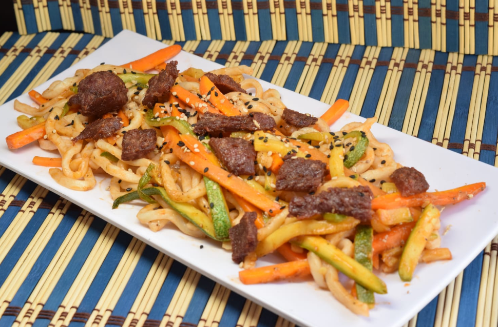 Pasta gruesa con verduras salteadas en salsa kushiage con arrachera.