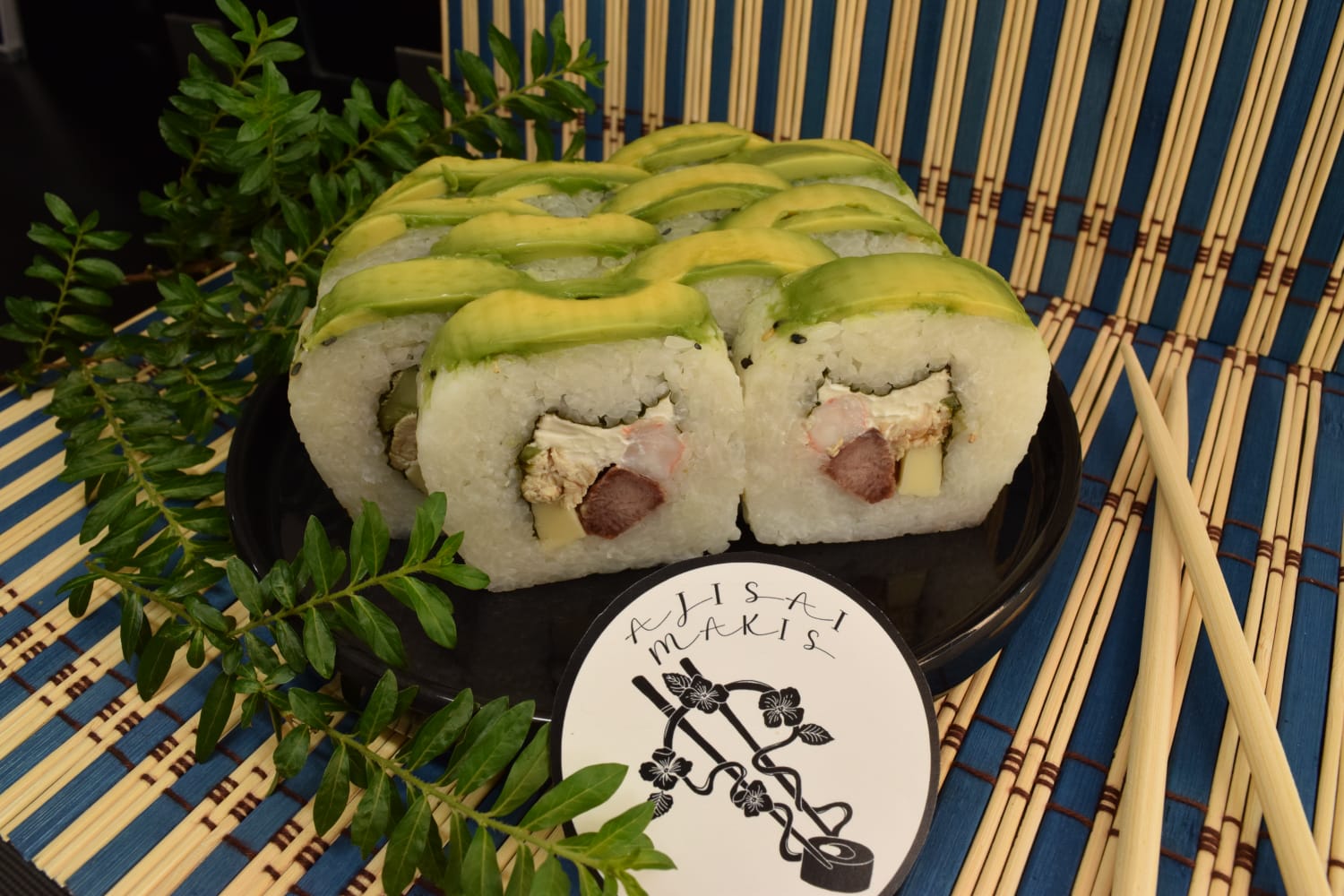 Rollo de arroz y alga con aguacate, pepino, Philadelphia y 1 ingrediente a escoger, incluye tampico.