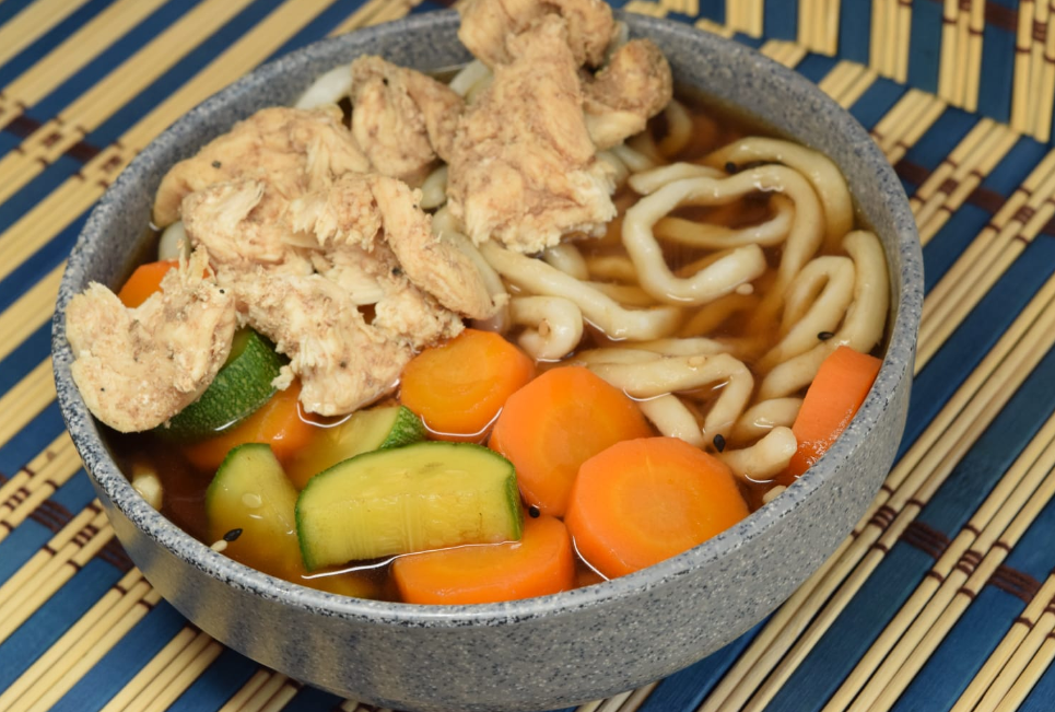 Caldo con pasta gruesa de trigo, con verduras y 2 ingredientes a elegir.