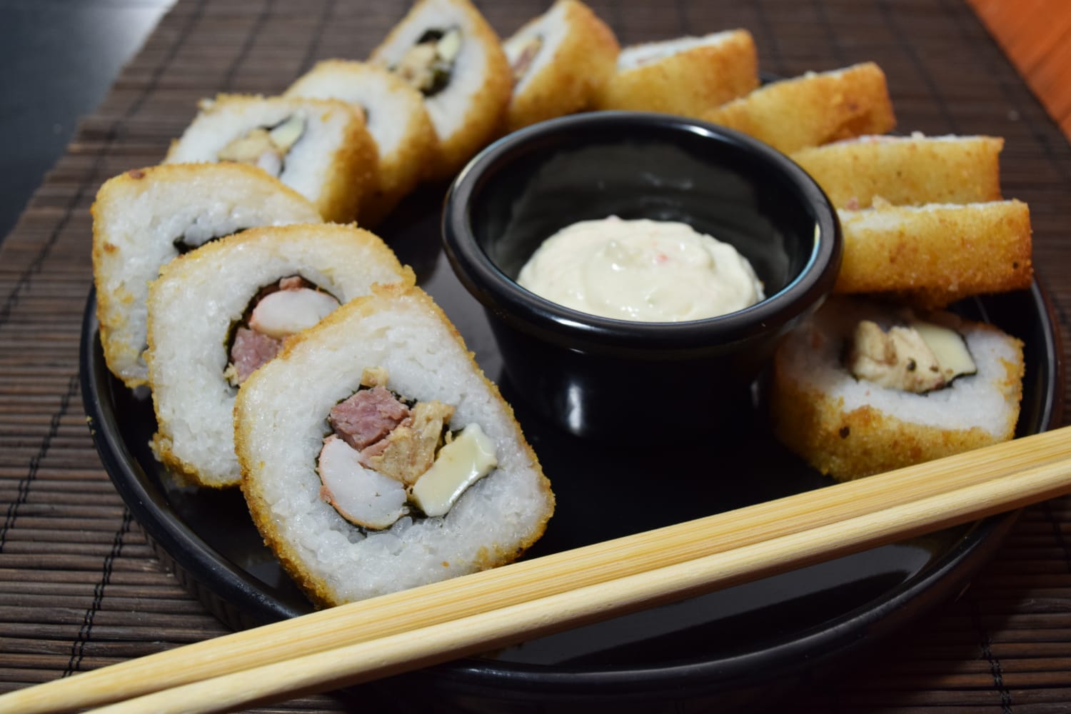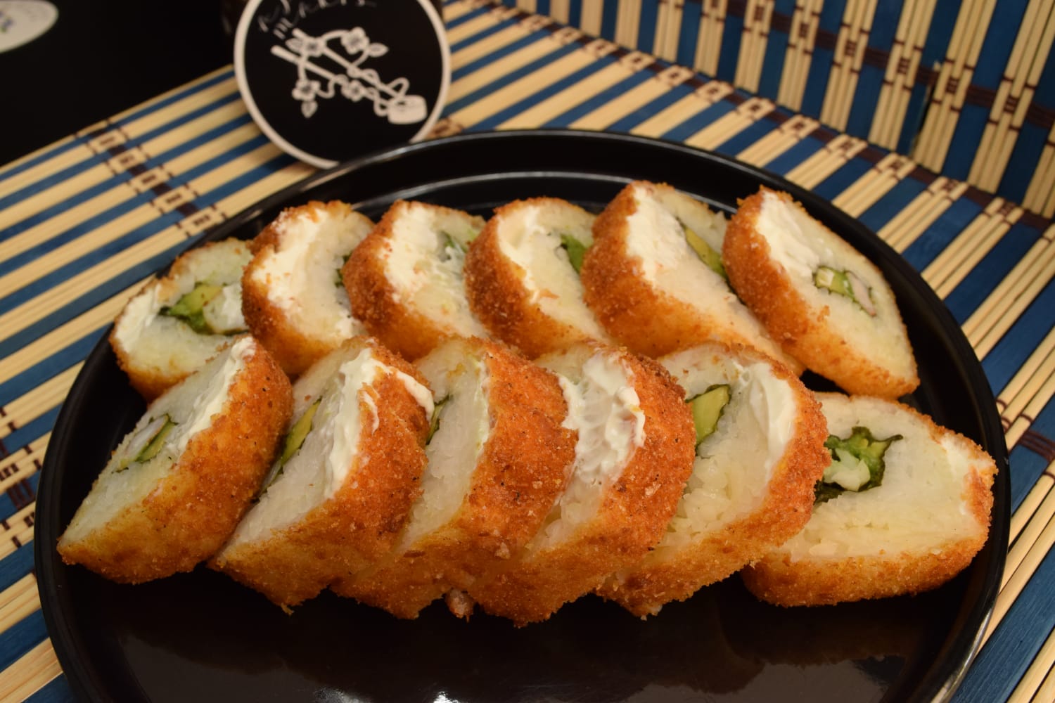 Rollo de arroz y alga con arrachera, pollo, camarón y manchego, incluye tampico.