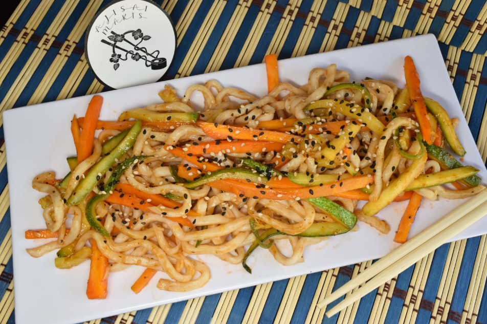 Pasta gruesa con verduras salteadas en salsa kushiage.