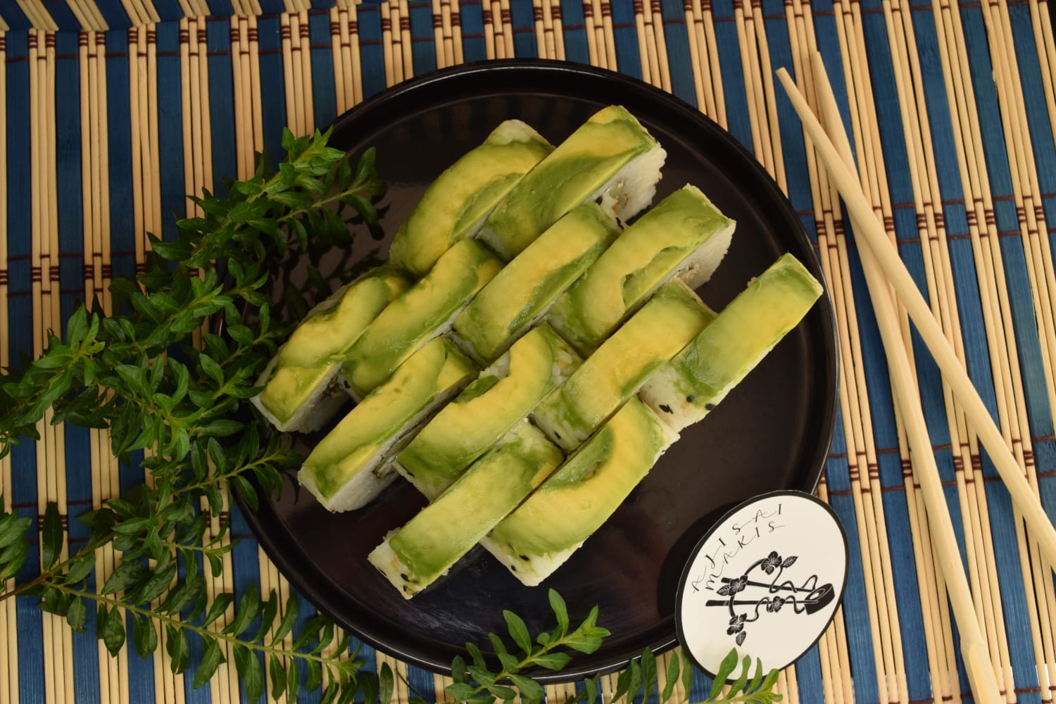 Rollo de arroz y alga con aguacate, manchego y 1 ingrediente a escoger.