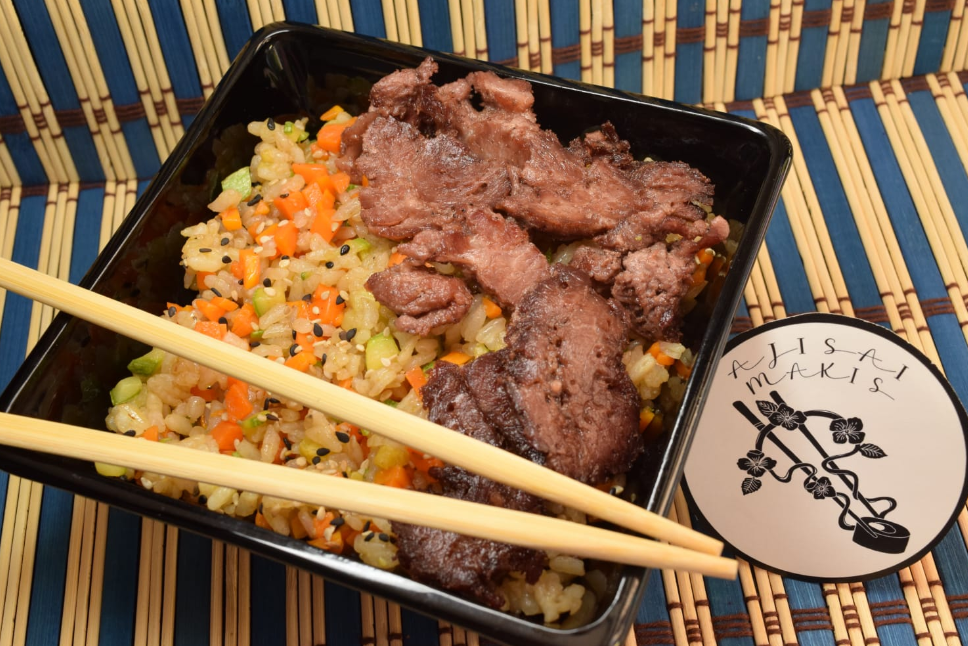 Arroz frito en mantequilla con verduras, sazonado en soya con arrachera.