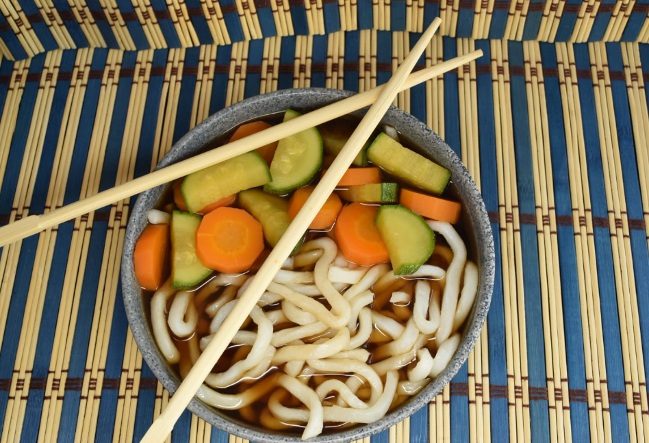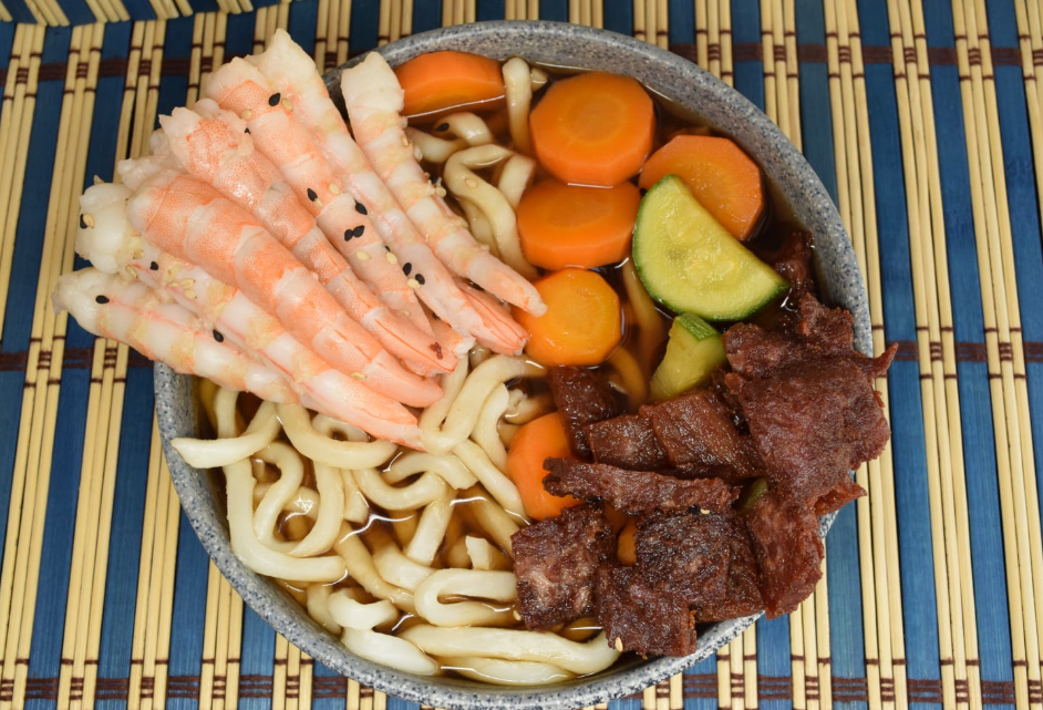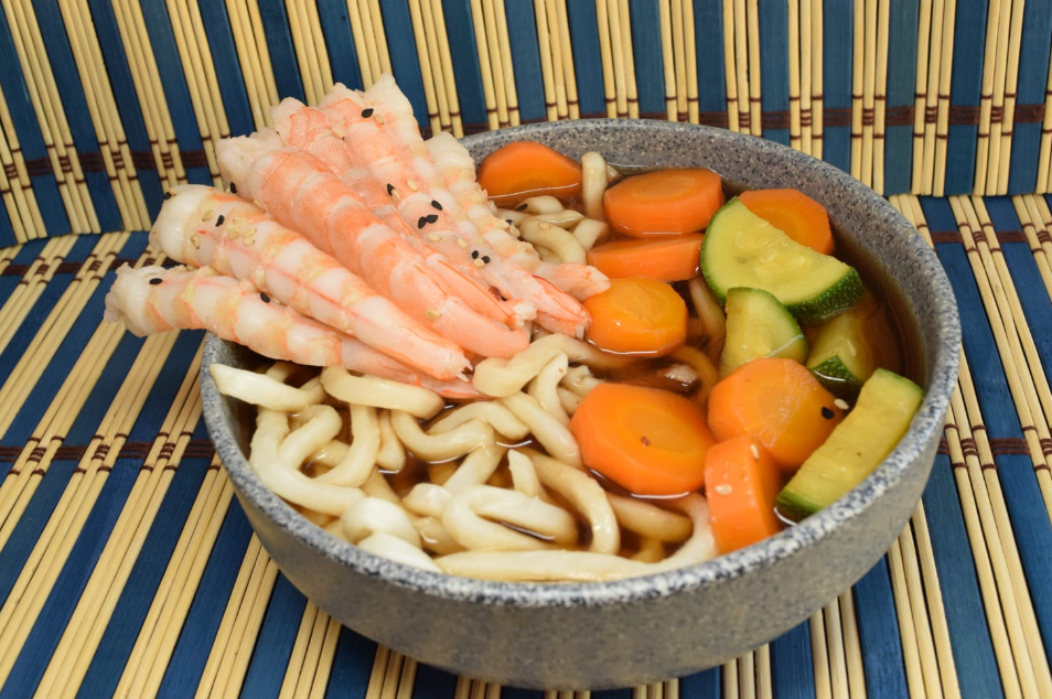Caldo de fideos gruesos de trigo, con verduras y camarón.