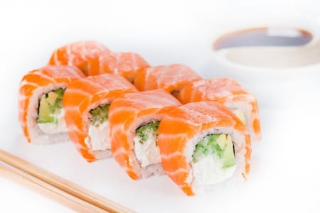 Rollo de arroz y alga con Philadelphia, aguacate y salmón encima.