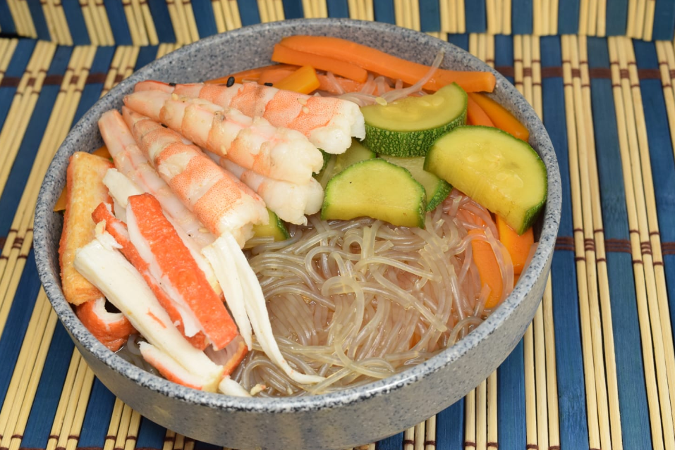 Caldo de fideos delgados de arroz, con verduras, camarón y surimi.