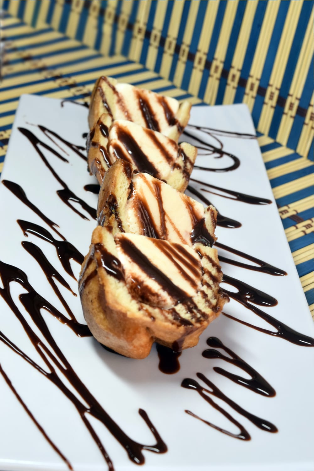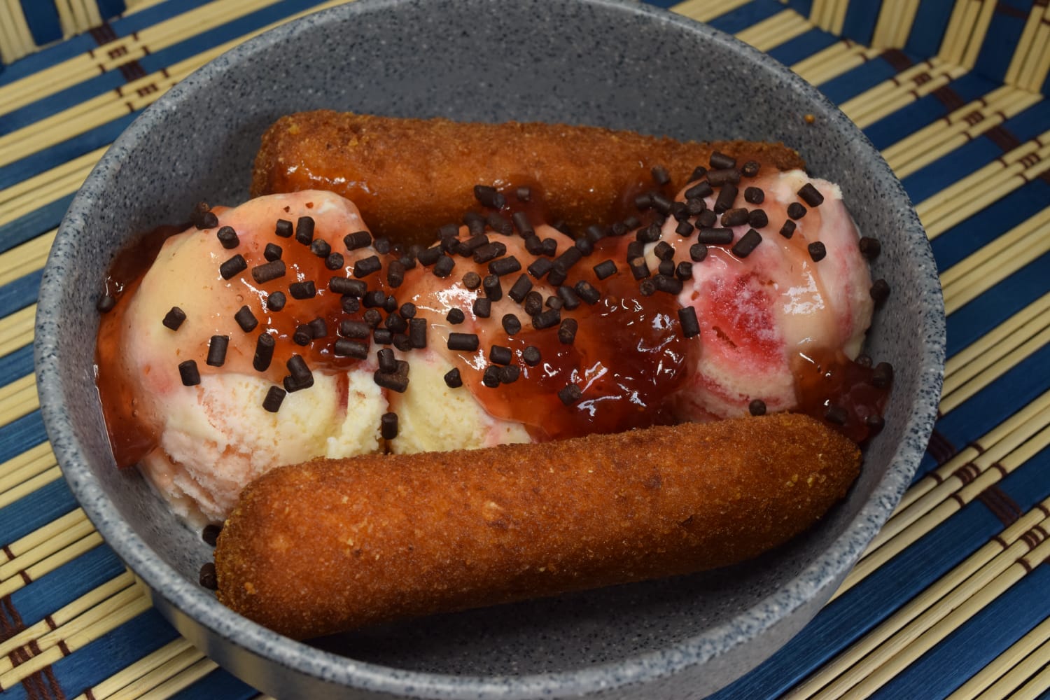 Platanos macho empanizados acompañados de helado y cobertura de fresa o chocolate.