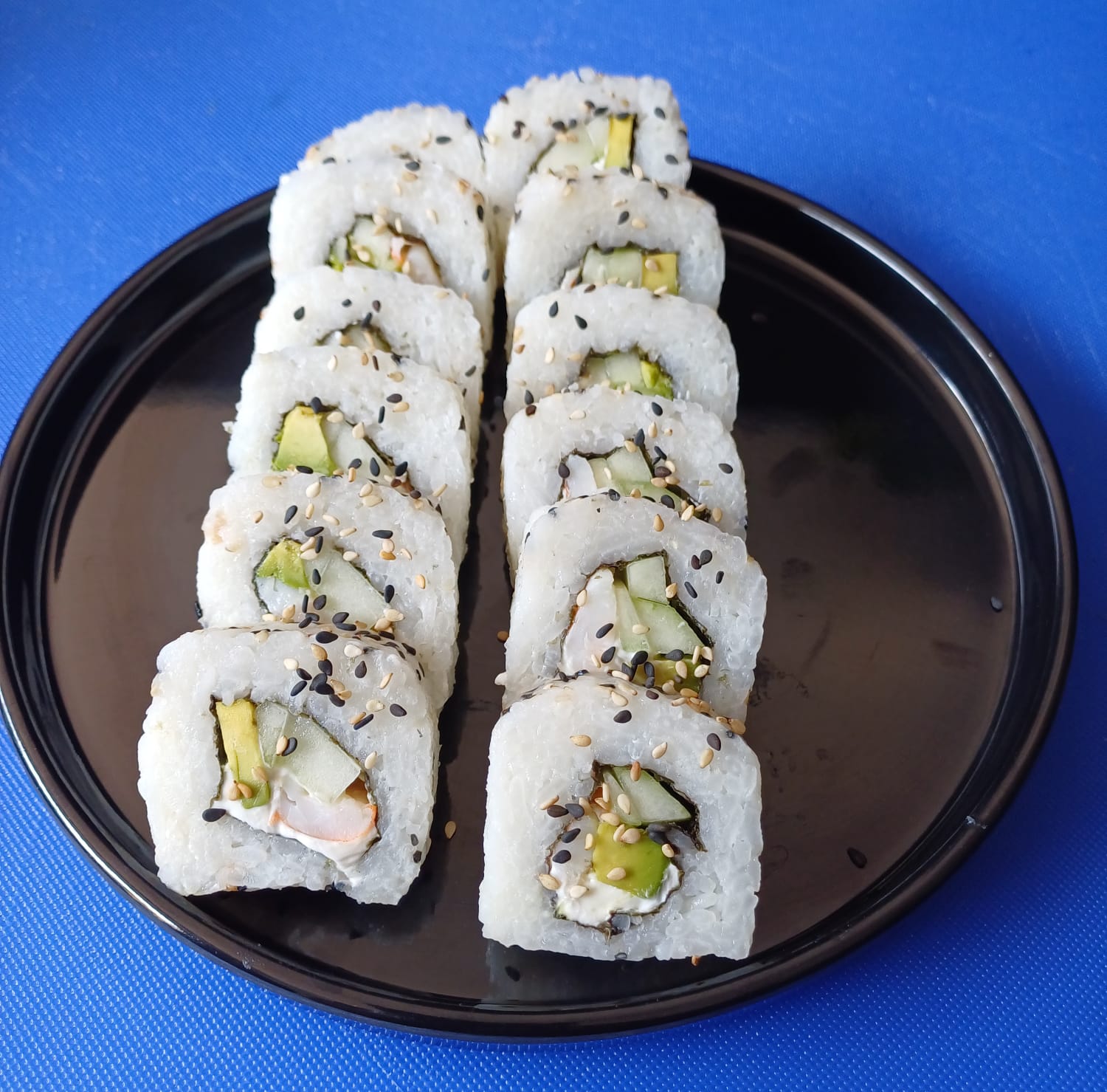 Rollo de arroz y alga con aguacate, pepino, Philadelphia y zanahoria, incluye tampico.