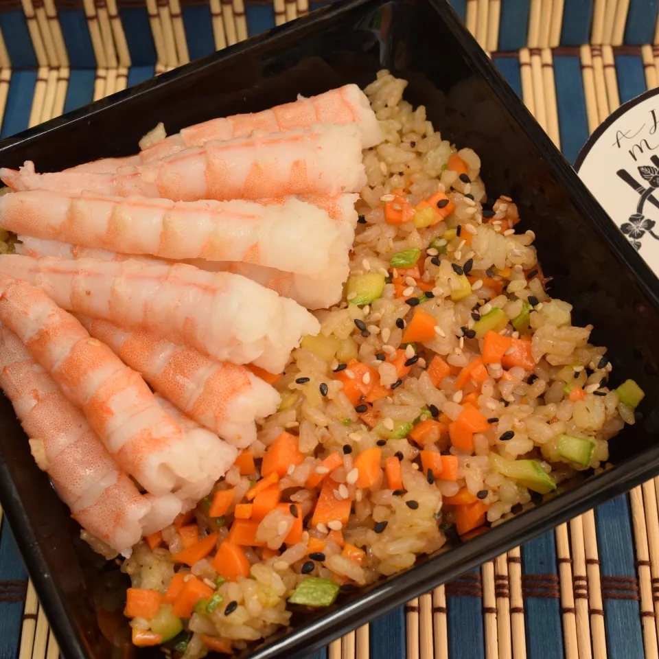 Arroz frito en mantequilla con verduras, sazonado en soya con arrachera, pollo, camarón, manchego, aguacate y aderezo tampico.